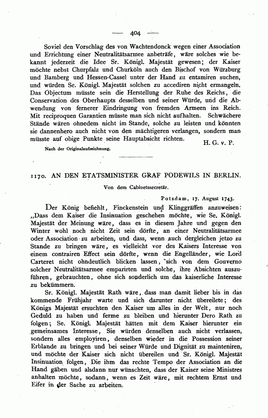 Der König befiehlt, Finckenstein und Klinggräffen anzuweisen: „Dass dem Kaiser die Insinuation geschehen möchte, wie Se. Königl. Majestät der Meinung wäre, dass es in diesem Jahre und gegen den Winter wohl noch nicht Zeit sein dörfte, an einer Neutralitätsarmee oder Association zu arbeiten, und dass, wenn auch dergleichen jetzo zu Stande zu bringen wäre, es vielleicht vor des Kaisers Interesse von einem contrairen Effect sein dörfte, wenn die Engelländer, wie Lord Carteret nicht ohndeutlich blicken lassen, sich von dem Gouverno solcher Neutralitätsarmee emparirten und solche, ihre Absichten auszuführen, gebrauchten, ohne sich sonderlich um das kaiserliche Interesse zu bekümmern.