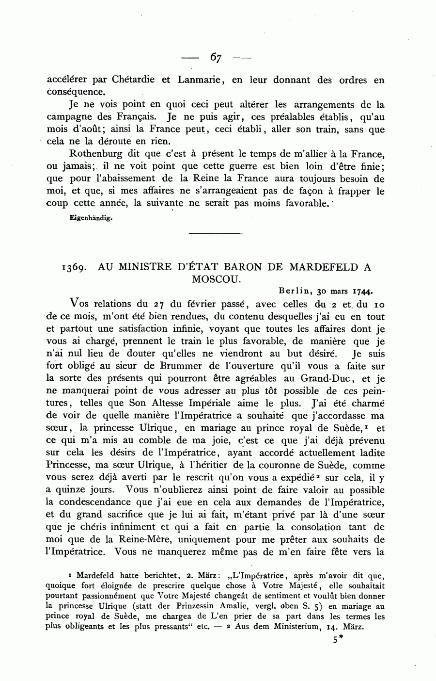 1 Mardefeld hatte berichtet, 2. März: „L'Impératrice, après m'avoir dit que,quoique fort éloignée de prescrire quelque chose à Votre Majesté, elle souhaitaitpourtant passionnément que Votre Majesté changeât de sentiment et voulût bien donnerla princesse Ulrique (statt der Prinzessin Amalie, vergl. oben S. 5) en mariage auprince royal de Suède, me chargea de L'en prier de sa part dans les termes lesplus obligeants et les plus pressants“ etc.