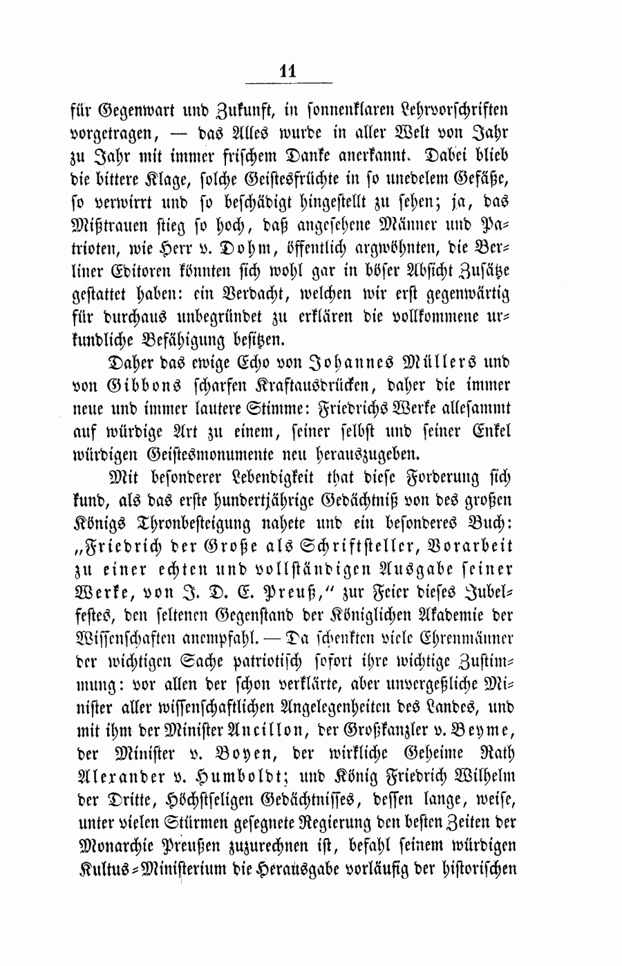 Mit besonderer Lebendigkeit that diese Forderung sich kund, als das erste hundertjährige Gedächtniß von des großen Königs Thronbesteigung nahete und ein besonderes Buch: « Friedrich der Große als Schriftsteller, Vorarbeit zu einer echten und vollständigen Ausgabe seiner Werke, von J. D. E. Preuß, » zur Feier dieses Jubelfestes, den seltenen Gegenstand der Königlichen Akademie der Wissenschaften anempfahl. - Da schenkten viele Ehrenmänner der wichtigen Sache patriotisch sofort ihre wichtige Zustimmung: vor allen der schon verklärte, aber unvergeßliche Minister aller wissenschaftlichen Angelegenheiten des Landes, und mit ihm der Minister Ancillon, der Großkanzler v. Beyme, der Minister v. Boyen, der wirkliche Geheime Rath Alexander v. Humboldt; und König Friedrich Wilhelm der Dritte, Höchstseligen Gedächtnisses, dessen lange, weise, unter vielen Stürmen gesegnete Regierung den besten Zeiten der Monarchie Preußen zuzurechnen ist, befahl seinem würdigen Kultus-Ministerium die Herausgabe vorläufig der historischen