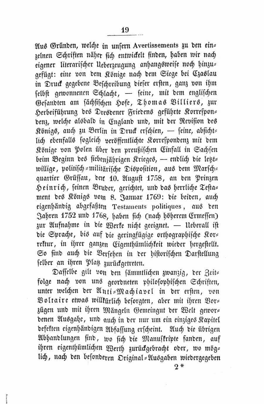 <19>Aus Gründen, welche in unsern Avertissements zu den einzelnen Schriften näher sich entwickelt finden, haben wir nach eigener literarischer Überzeugung anhangsweise noch hinzugefügt: eine von dem Könige nach dem Siege bei Czaslau in Druck gegebene Beschreibung dieser ersten, ganz von ihm selbst gewonnenen Schlacht, - seine, mit dem englischen Gesandten am sächsischen Hofe, Thomas Villiers, zur Herbeiführung des Dresdener Friedens geführte Korrespondenz, welche alsbald in England und, mit der Revision des Königs, auch zu Berlin in Druck erschien, - seine, absichtlich ebenfalls sogleich veröffentlichte Korrespondenz mit dem Könige von Polen über den preußischen Einfall in Sachsen beim Beginn des siebenjährigen Krieges, - endlich die letztwillige, politisch-militärische Disposition, aus dem Marschquartier Grüssau, den 10. August 1758, an den Prinzen Heinrich, seinen Bruder, gerichtet, und das herrliche Testament des Königs vom 8. Januar 1769: die beiden, auch eigenhändig abgefaßten Testaments politiques, aus den Jahren 1752 und 1768, haben sich (nach höherem Ermessen) zur Aufnahme in die Werke nicht geeignet. - Ueberall ist die Sprache, bis auf die geringfügige orthographische Korrektur, in ihrer ganzen Eigenthümlichkcit wieder hergestellt. So sind auch die Versehen in der historischen Darstellung selber an ihren Platz zurückgetreten.