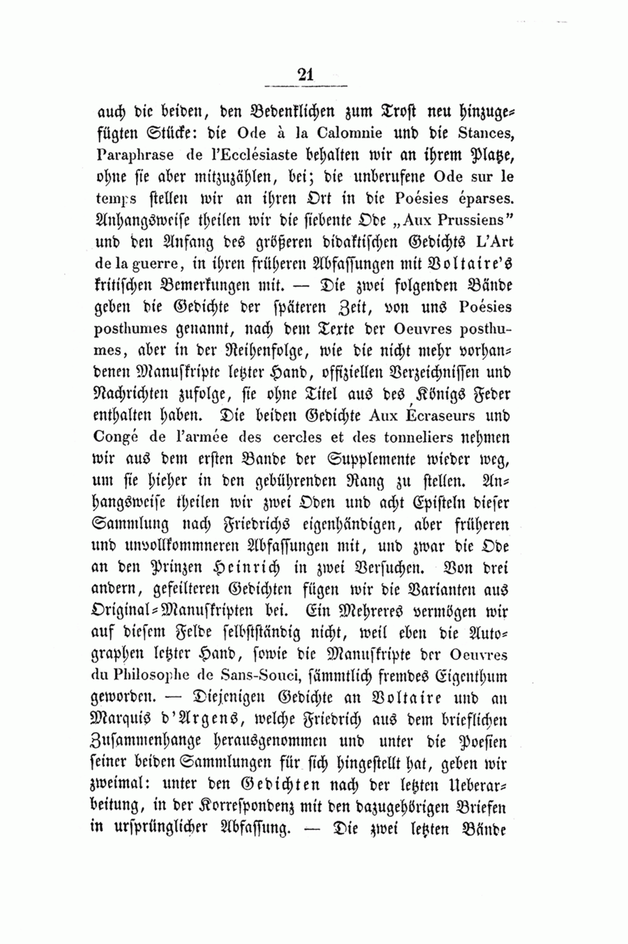 <21>auch die beiden, den Bedenklichen zum Trost neu hinzugefügten Stücke: die Ode à la Calomnie und die Stances, Paraphrase de l'Ecclésiaste behalten wir an ihrem Platze, ohne sie aber mitzuzählen, bei; die unberufene Ode sur le temps stellen wir an ihren Ort in die Poésies éparses. Anhangsweise theilen wir die siebente Ode « Aux Prussiens » und den Anfang des größeren didaktischen Gedichts L'Art de la guerre, in ihren früheren Abfassungen mit Voltaire's kritischen Bemerkungen mit. - Die zwei folgenden Bände geben die Gedichte der späteren Zeit, von uns Poésies posthumes genannt, nach dem Texte der Oeuvres posthumes, aber in der Reihenfolge, wie die nicht mehr vorhandenen Manuskripte letzter Hand, offiziellen Verzeichnissen und Nachrichten zufolge, sie ohne Titel aus des Königs Feder enthalten haben. Die beiden Gedichte Aux Écraseurs und Congé de l'armée des cercles et des tonneliers nehmen wir aus dem ersten Bande der Supplemente wieder weg, um sie hieher in den gebührenden Rang zu stellen. Anhangsweise theilen wir zwei Oden und acht Episteln dieser Sammlung nach Friedrichs eigenhändigen, aber früheren und unvollkommneren Abfassungen mit, und zwar die Ode an den Prinzen Heinrich in zwei Versuchen. Von drei andern, gefeilteren Gedichten fügen wir die Varianten aus Original-Manuskripten bei. Ein Mehreres vermögen wir auf diesem Felde selbstständig nicht, weil eben die Autographen letzter Hand, sowie die Manuskripte der Oeuvres du Philosophe de Sans-Souci, sämmtlich fremdes Eigenthum geworden. - Diejenigen Gedichte an Voltaire und an Marquis d'Argens, welche Friedrich aus dem brieflichen Zusammenhange herausgenommen und unter die Poesien seiner beiden Sammlungen für sich hingestellt hat, geben wir zweimal: unter den Gedichten nach der letzten Ueberarbeitung, in der Korrespondenz mit den dazugehörigen Briefen in ursprünglicher Abfassung. - Die zwei letzten