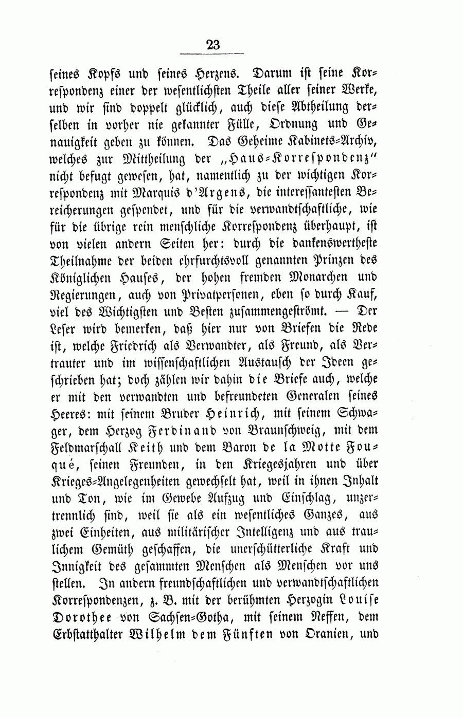 <23>seines Kopfs und seines Herzens. Darum ist seine Korrespondenz einer der wesentlichsten Theile aller seiner Werke, und wir sind doppelt glücklich, auch diese Abtheilung derselben in vorher nie gekannter Fülle, Ordnung und Genauigkeit geben zu können. Das Geheime Kabinets-Archiv, welches zur Mittheilung der « Haus-Korrespondenz » nicht befugt gewesen, hat, namentlich zu der wichtigen Korrespondenz mit Marquis d'Argens, die interessantesten Bereicherungen gespendet, und für die verwandtschaftliche, wie für die übrige rein menschliche Korrespondenz überhaupt, ist von vielen andern Seiten her: durch die dankenswertheste Theilnahme der beiden ehrfurchtsvoll genannten Prinzen des Königlichen Hauses, der hohen fremden Monarchen und Regierungen, auch von Privatpersonen, eben so durch Kauf, viel des Wichtigsten und Besten zusammengeströmt. - Der Leser wird bemerken, daß hier nur von Briefen die Rede ist, welche Friedrich als Verwandter, als Freund, als Vertrauter und im wissenschaftlichen Austausch der Ideen geschrieben hat; doch zählen wir dahin die Briefe auch, welche er mit den verwandten und befreundeten Generalen seines Heeres: mit seinem Bruder Heinrich, mit seinem Schwager, dem Herzog Ferdinand von Braunschweig, mit dem Feldmarschall Keith und dem Baron de la Motte Fouqué, seinen Freunden, in den Kriegesjahren und über Kriegcs-Angelegenheiten gewechselt hat, weil in ihnen Inhalt und Ton, wie im Gewebe Aufzug und Einschlag, unzertrennlich sind, weil sie als ein wesentliches Ganzes, aus zwei Einheiten, aus militärischer Intelligenz und aus traulichem Gemüth geschaffen, die unerschütterliche Kraft und Innigkeit des gesammten Menschen als Menschen vor uns stellen. In andern freundschaftlichen und verwandtschaftlichen Korrespondenzen, z. B. mit der berühmten Herzogin Louise Dorothee von Sachsen-Gotha, mit seinem Neffen, dem Erbstatthalter Wilhelm dem Fünften von Oranien, und