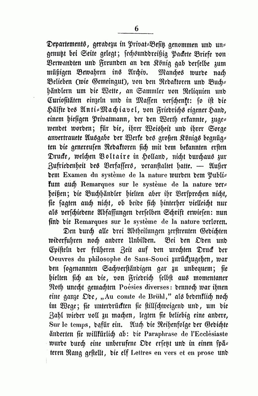 <6>Departements, geradezu in Privat-Besitz genommen und ungenutzt bei Seite gelegt; sechsunddreißig Packete Briefe von Verwandten und Freunden an den König gab derselbe zum müßigen Bewahren ins Archiv. Manches wurde nach Belieben (wie Gemeingut), von den Redaktoren und Buchhändlern um die Wette, an Sammler von Reliquien und Curiositäten einzeln und in Massen verschenkt: so ist die Hälfte des Anti-Machiavel, von Friedrichs eigener Hand, einem hiesigen Privatmann, der den Werth erkannte, zugewendet worden; für die, ihrer Weisheit und ihrer Sorge anvertrauete Ausgabe der Werke des großen Königs begnügten die genereusen Redaktoren sich mit dem bekannten ersten Drucke, welchen Voltaire in Holland, nicht durchaus zur Zufriedenheit des Verfassers, veranstaltet hatte. - Außer dem Examen du système de la nature wurden dem Publikum auch Remarques sur le système de la nature verheißen; die Buchhändler hielten aber ihr Versprechen nicht, sie sagten auch nicht, ob beide sich hinterher vielleicht nur als Verschiedene Abfassungen derselben Schrift erwiesen: nun sind die Remarques sur le système de la nature verloren.