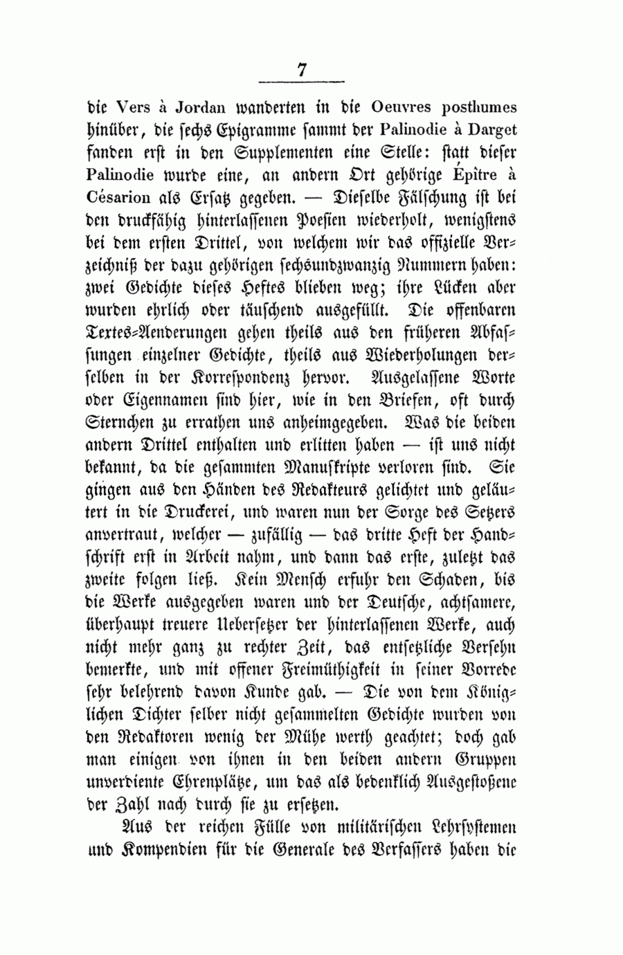<7>die Vers à Jordan wanderten in die Oeuvres posthumes hinüber, die sechs Epigramme sammt der Palinodie à Darget fanden erst in den Supplementen eine Stelle: statt dieser Palinodie wurde eine, an andern Ort gehörige Épître à Césarion als Ersatz gegeben. - Dieselbe Fälschung ist bei den druckfähig hinterlassenen Poesien wiederholt, wenigstens bei dem ersten Drittel, von welchem wir das offizielle Verzeichniß der dazu gehörigen sechsundzwanzig Nummern haben: zwei Gedichte dieses Heftes blieben weg; ihre Lücken aber wurden ehrlich oder täuschend ausgefüllt. Die offenbaren Textes-Aenderungen gehen theils aus den früheren Abfassungen einzelner Gedichte, theils aus Wiederholungen derselben in der Korrespondenz hervor. Ausgelassene Worte oder Eigennamen sind hier, wie in den Briefen, oft durch Sternchen zu errathen uns anheimgegeben. Was die beiden andern Drittel enthalten und erlitten haben - ist uns nicht bekannt, da die gesammten Manuskripte verloren sind. Sie gingen aus den Händen des Redakteurs gelichtet und geläutert in die Druckerei, und waren nun der Sorge des Setzers anvertraut, welcher - zufällig - das dritte Heft der Handschrift erst in Arbeit nahm, und dann das erste, zuletzt das zweite folgen ließ. Kein Mensch erfuhr den Schaden, bis die Werke ausgegeben waren und der Deutsche, achtsamere, überhaupt treuere Uebersetzer der hinterlassenen Werke, auch nicht mehr ganz zu rechter Zeit, das entsetzliche Versehn bemerkte, und mit offener Freimüthigkeit in seiner Vorrede sehr belehrend davon Kunde gab. - Die von dem Königlichen Dichter selber nicht gesammelten Gedichte wurden von den Redaktoren wenig der Mühe werth geachtet; doch gab man einigen von ihnen in den beiden andern Gruppen unverdiente Ehrenplätze, um das als bedenklich Ausgestoßene der Zahl nach durch sie zu ersetzen.