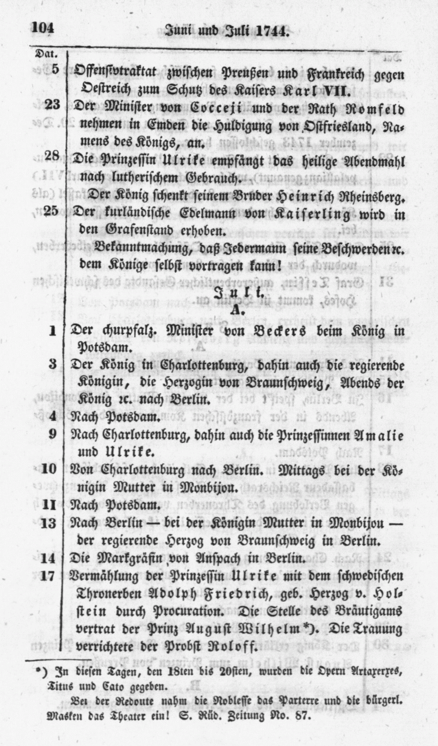 + In diesen Tagen, den 18ten bis 20sten, wurden die Opern Artaxerxes, Titus und Cato gegeben. Bei der Redoute nahm die Noblesse das Parterre und die bürgerl. Masken das Theater ein! S. Rüd. Zeitung No. 87.