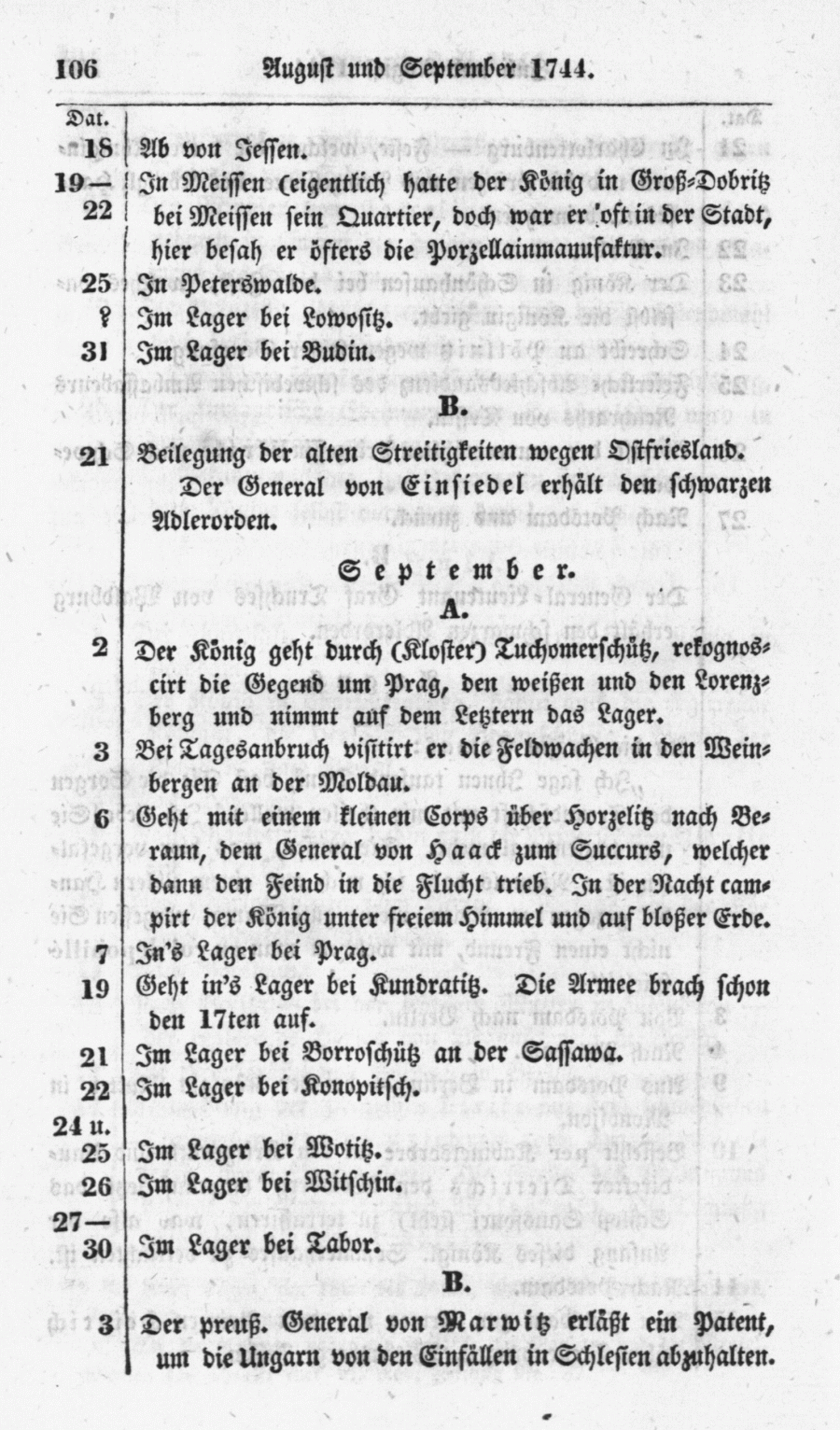 Geht mit einem kleinen Corps über Horzelitz nach Beraun, dem General von Haack zum Succurs, welcher dann den Feind in die Flucht trieb. In der Nacht campirt der König unter freiem Himmel und auf bloßer Erde.