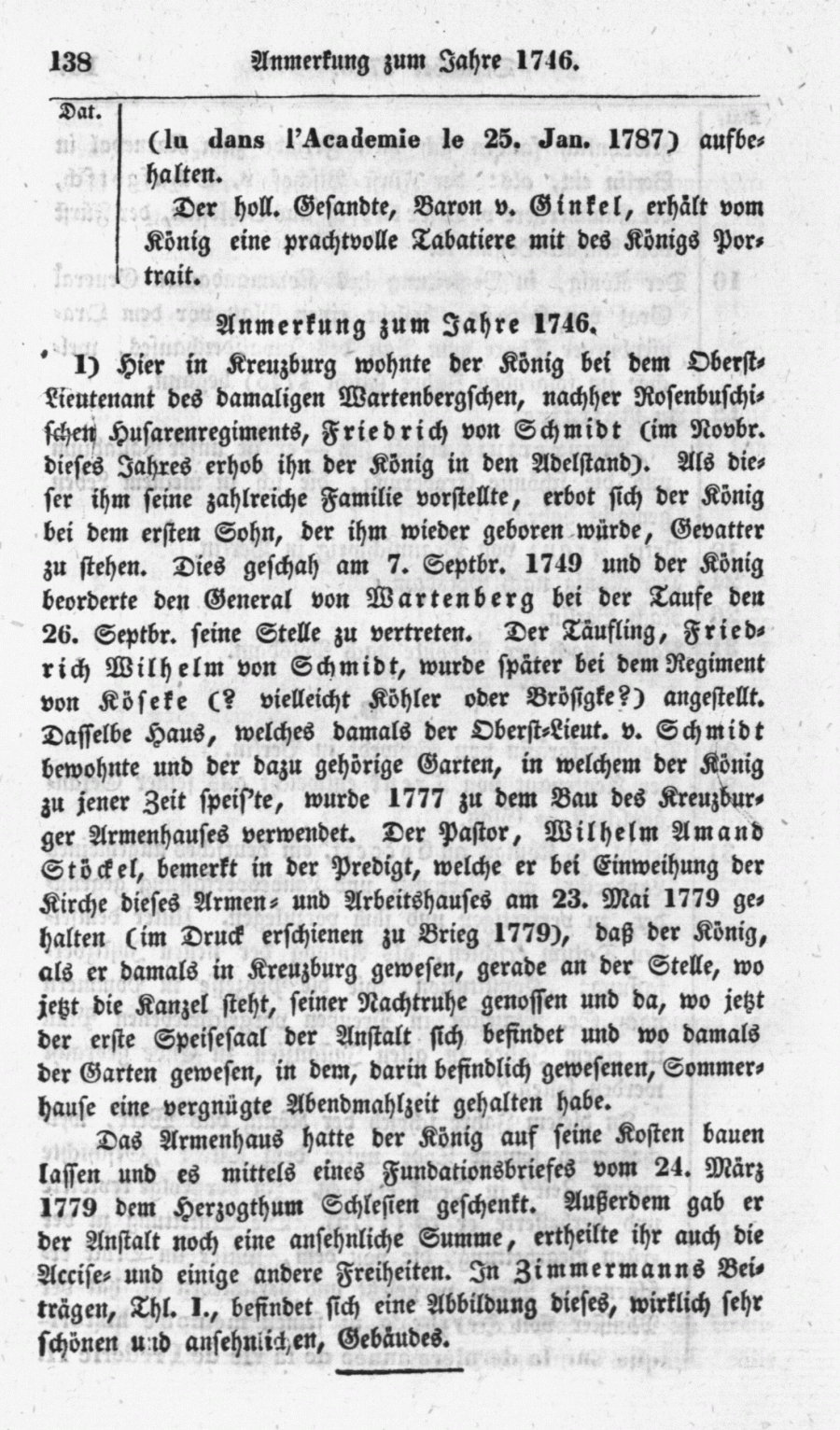 1) Hier in Kreuzburg wohnte der König bei dem Oberst-Lieutenant des damaligen Wartenbergschen, nachher Rosenbuschischen Husarenregiments, Friedrich von Schmidt (im Novbr. dieses Jahres erhob ihn der König in den Adelstand). Als dieser ihm seine zahlreiche Familie vorstellte, erbot sich der König bei dem ersten Sohn, der ihm wieder geboren würde, Gevatter zu stehen. Dies geschah am 7. Septbr. 1749 und der König beorderte den General von Wartenberg bei der Taufe den 26. Septbr. seine Stelle zu vertreten. Der Täufling, Friedrich Wilhelm von Schmidt, wurde später bei dem Regiment von Köseke (? vielleicht Köhler oder Brösigke?) angestellt. Dasselbe Haus, welches damals der Oberst-Lieut. v. Schmidt bewohnte und der dazu gehörige Garten, in welchem der König zu jener Zeit speiste, wurde 1777 zu dem Bau des Kreuzburger Armenhauses verwendet. Der Pastor, Wilhelm Amand Stöckel, bemerkt in der Predigt, welche er bei Einweihung der Kirche dieses Armen- und Arbeitshauses am 23. Mai 1779 gehalten (im Druck erschienen zu Brieg 1779), daß der König, als er damals in Kreuzburg gewesen, gerade an der Stelle, wo jetzt die Kanzel steht, seiner Nachtruhe genossen und da, wo jetzt der erste Speisesaal der Anstalt sich befindet und wo damals der Garten gewesen, in dem, darin befindlich gewesenen, Sommerhause eine vergnügte Abendmahlzeit gehalten habe.