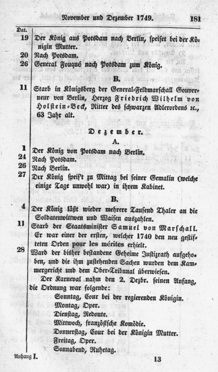 Starb der Staatsminister Samuel von Marschall. Er war einer der ersten, welcher 1740 den neu gestifteten Orden pour les mérites erhielt.
