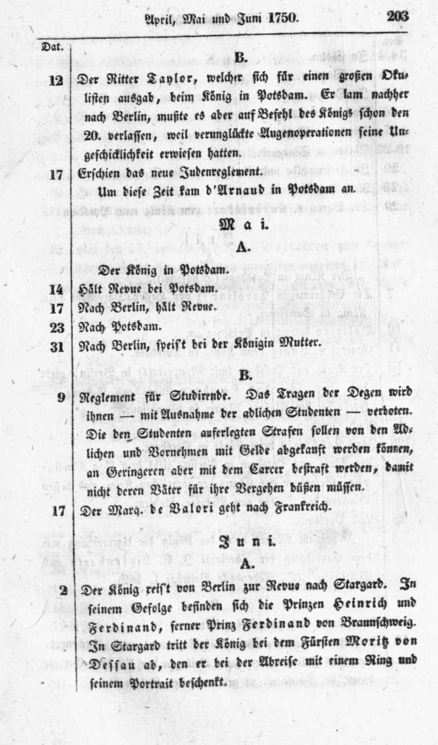 Der Ritter Taylor, welche sich für einen großen Okulisten ausgab, beim König in Potsdam. Er kam nachher nach Berlin, mußte es aber auf Befehl des Königs schon den 20. verlassen, weil verunglückte Augenoperationen seine Ungeschicklichkeit erwiesen hatten.