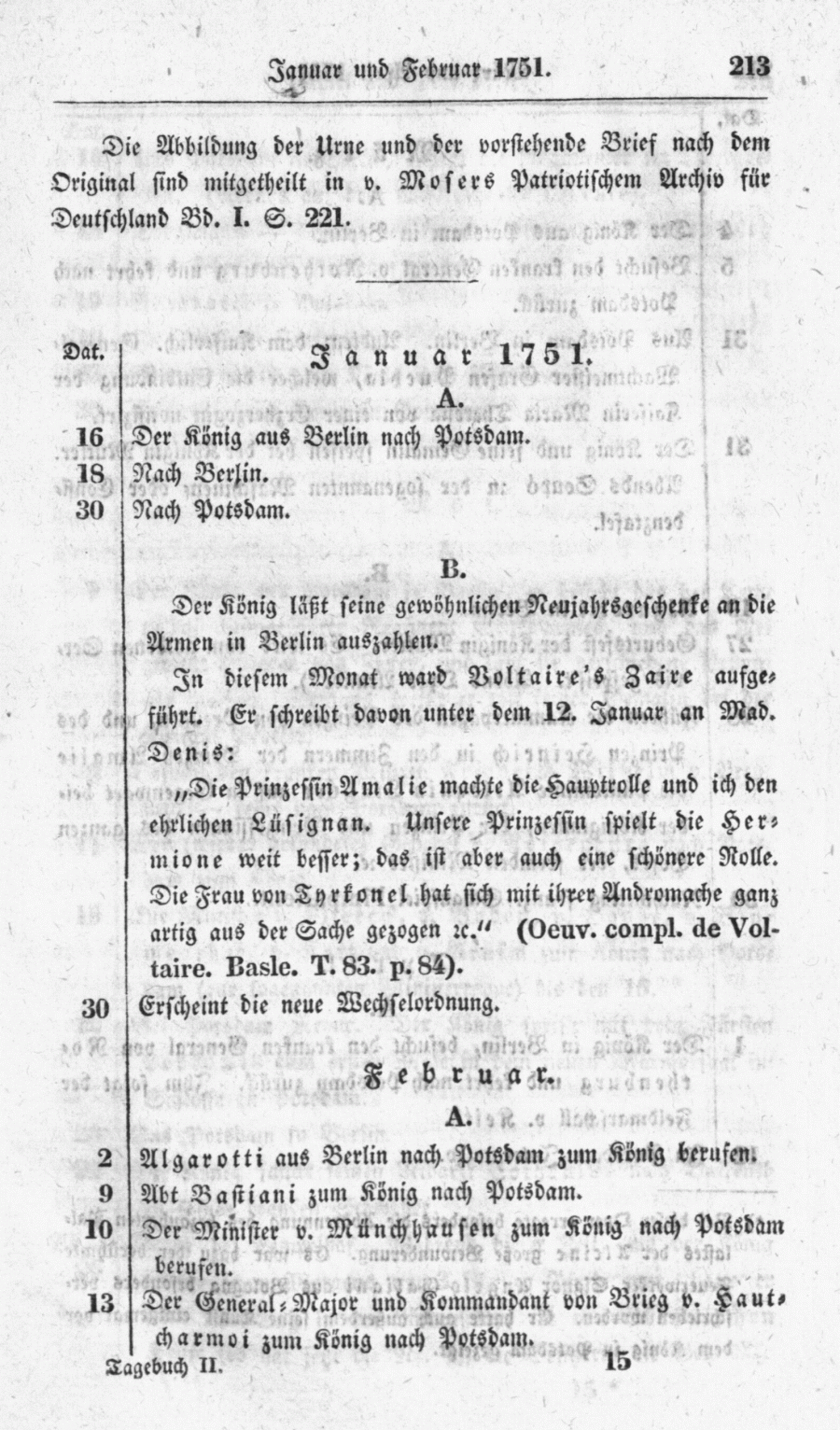 In diesem Monat ward Voltaire's Zaire aufgeführt. Er schreibt davon unter dem 12. Januar an Mad. Denis: