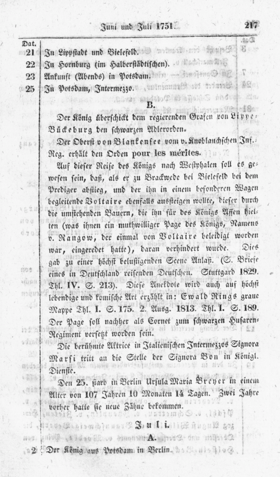 Auf dieser Reise des Königs nach Westphalen soll es gewesen sein, daß, als er zu Brackwede bei Bielefeld bei dem Prediger abstieg, und der ihn in einem besonderen Wagen begleitende Voltaire ebenfalls aussteigen wollte, dieser durch die umstehenden Bauern, die ihn für des Königs Affen hieltten (was ihnen ein muthwilliger Page des Königs, Namens v. Nangow, der einmal von Voltaire beleidigt worden war, eingeredet hatte), daran verhindert wurde. Dies gab zu einer höchst belustigenden Scene Anlaß. (S. Briefe eines in Deutschland reisenden Deutschen. Stuttgard 1829. Thl. IV. S. 213). Diese Anekdote wird auch auf höchst lebendige und komische Art erzählt in: Ewald Rings graue Mappe Thl. 1. S. 175. 2. Ausg. 1813. Thl. 1. S. 189. Der Page soll nachher als Cornet zum schwarzen Husaren-Regiment versetzt worden sein.