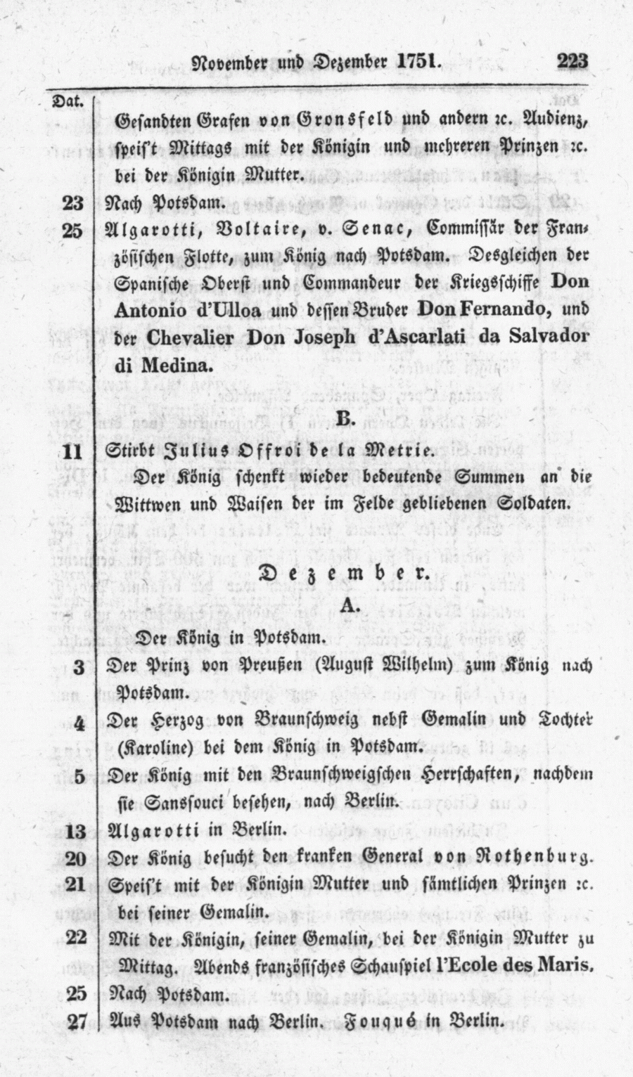 Algarotti, Voltaire, v. Senac, Commissär der Französischen Flotte, zum König nach Potsdam. Desgleichen der Spanische Oberst und Commandeur der Kriegsschiffe von Antonio d'Ulloa und dessen Bruder Don Fernando, und der Chevailer Don Josph d'Ascarlati da Salvador di Medina.