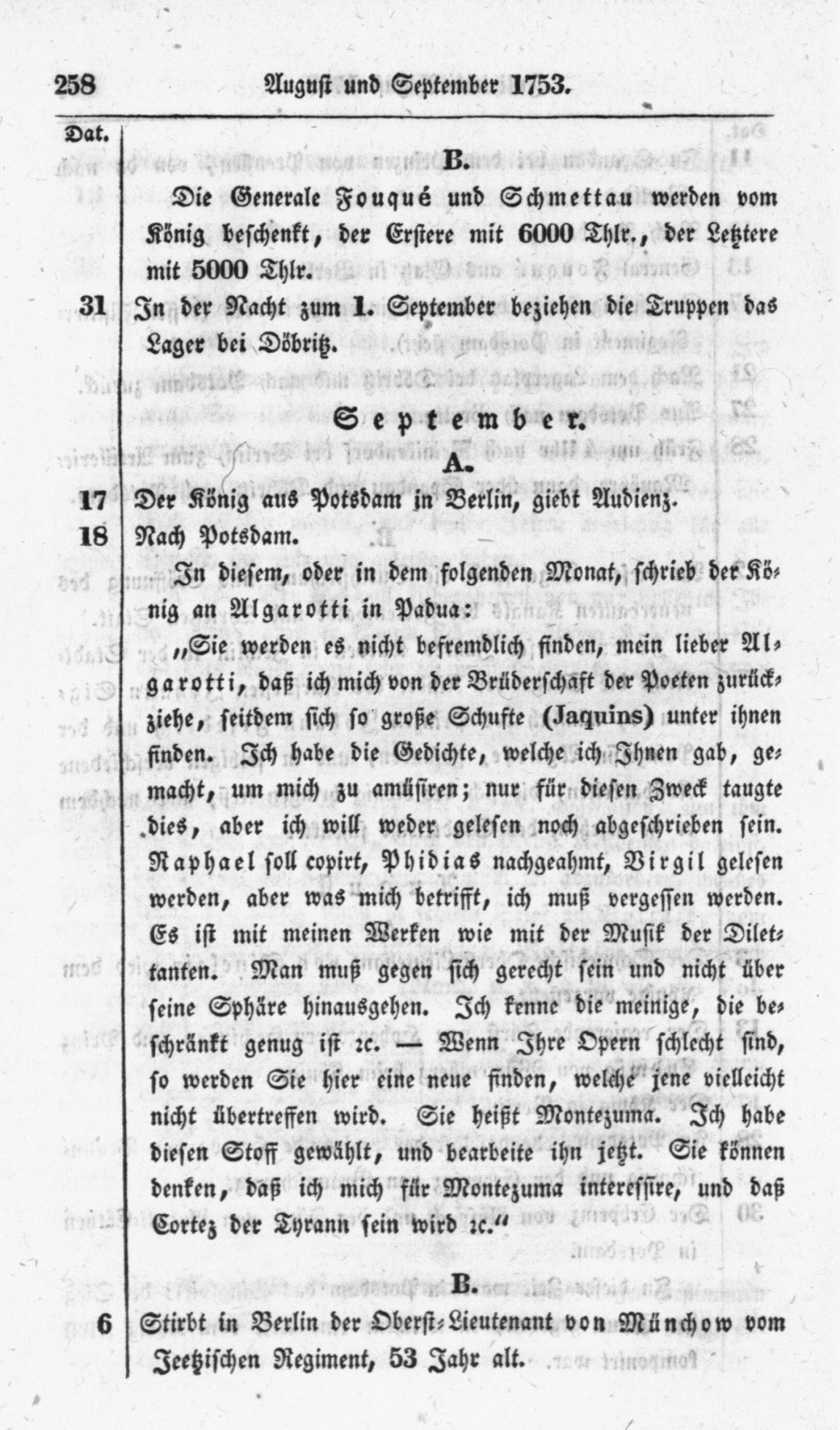 "Sie werden es nicht befremdlich finden, mein lieber Algarotti, daß ich mich von der Brüderschaft der Poeten zurückziehe, seitdem sich so große Schufte (Jaquins) unter ihnen finden. Ich habe die Gedichte, welche ich Ihnen gab, gemacht, um mich zu amüsiren; nur für diesen Zweck taugte dies, aber ich will weder gelesen noch abgeschrieben sein. Raphael soll copirt, Phidias nachgeahmt, Virgil gelesen werden, aber was mich betrifft, ich muß vergessen werden. Es ist mit meinen Werken wie mit der Musik der Dilettanten. Man muß gegen sich gerecht sein und nicht über seine Sphäre hinausgehen. Ich kenne die meinige, die beschränkt genug ist etc. - Wenn Ihre Opern schlecht sind, so werden Sie hier eine neue finden, welche jene vielleicht nicht übertreffen wird. Sie heißt Montezuma. Ich habe diesen Stoff gewählt, und bearbeite ihn jetzt. Sie können denken, daß ich mich für Montezuma interessire, und daß Cortez der Tyrann sein wird etc."