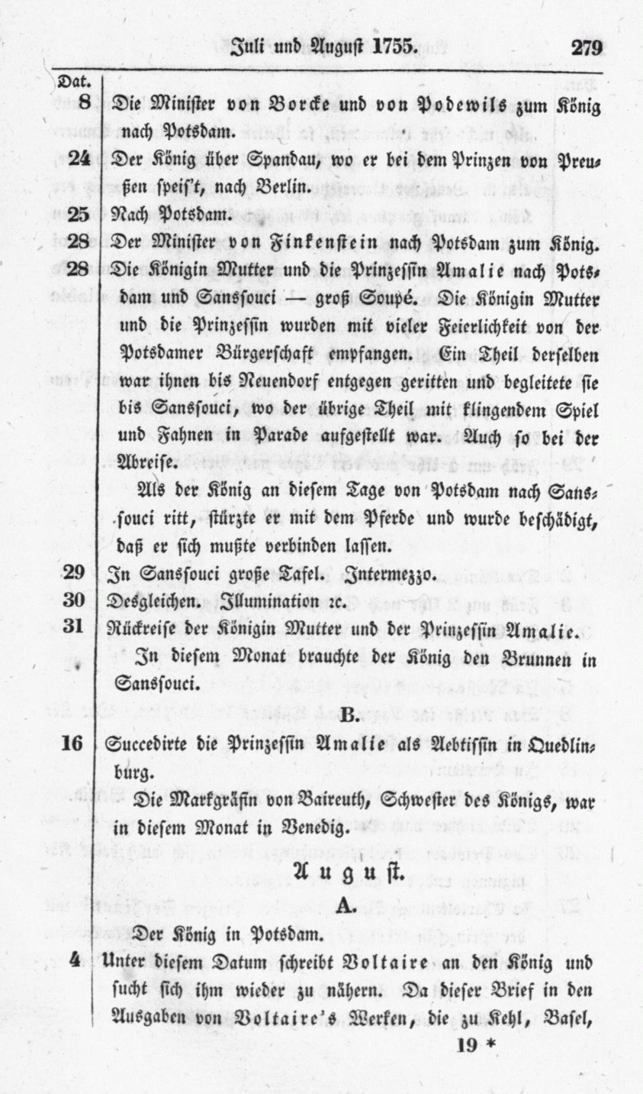 Als der König an diesem Tage von Potsdam nach Sanssouci ritt, stürzte er mit dem Pferde und wurde beschädigt, daß er sich mußte verbinden lassen.