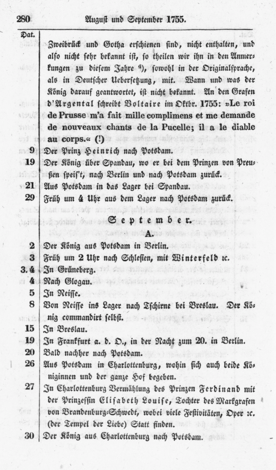 <280> Zweibrück und Gotha erschienen sind, nicht enthalten, und also nicht sehr bekannt ist, so theilen wir ihn in den Anmerkungen zu diesem Jahre 4), sowohl in der Originalsprache, als in Deutscher Übersetzung, mit. Wann und was der König darauf geantwortet, ist nicht bekannt. An den Grafen d'Argental schreibt Voltaire im Oktbr. 1755: "Le roi de Prusse m'a fait mille complimens et me demande de nouveaux chants de la Pucelle; il a le diable au corps." (!)