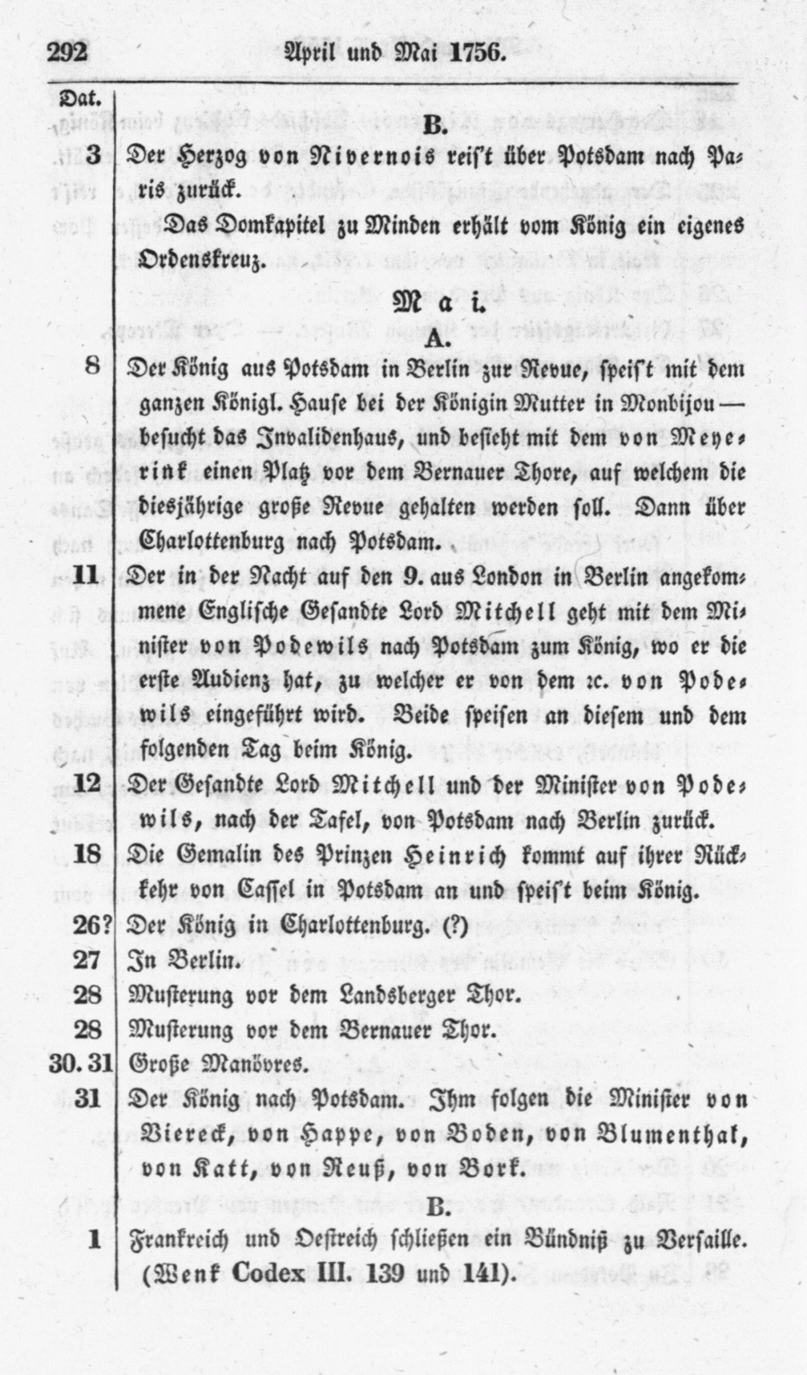 Der König aus Potsdam in Berlin zur Revue, speist mit dem ganzen Königl. Hause bei der Königin Mutter in Monbijou - besucht das Invalidenhaus, und besieht mit dem von Meyerink einen Platz vor dem Bernauer Thore, auf welchem die diesjährige große Revue gehalten werden soll. Dann über Charlottenburg nach Potsdam.