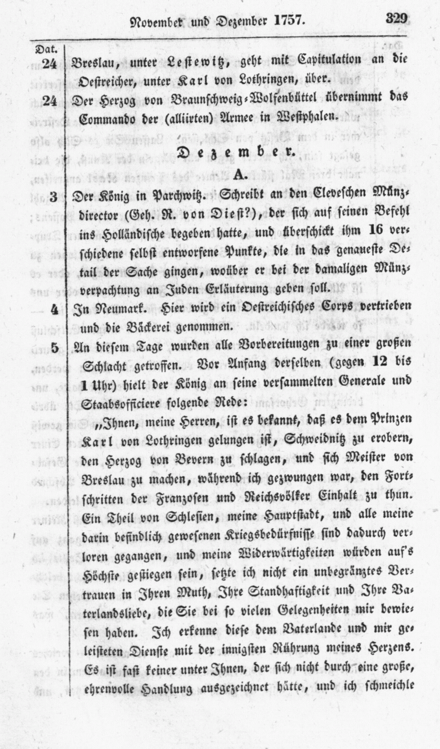 "Ihnen, meine Herren, ist es bekannt, daß es dem Prinzen Karl von Lothringen gelungen ist, Schweidnitz zu erobern, den Herzog von Bevern zu schlagen, und sich Meister von Breslau zu machen, während ich gezwungen war, den Fortschritten der Franzosen und Reichsvölker Einhalt zu thun. Ein Theil von Schlesien, meine Hauptstadt, und alle meine darin befindlich gewesenen Kriegsbedürfnisse sind dadurch verloren gegangen, und meine Widerwärtigkeiten würden aufs Höchste gestiegen sein, setzte ich nicht ein unbegränztes Vertrauen in Ihren Muth, Ihre Sündhaftigkeit und Ihre Vaterlandsliebe, die Sie bei so vielen Gelegenheiten mir bewiesen haben. Ich erkenne diese dem Vaterlande und mir geleisteten Dienste mit der innigsten Rührung meines Herzens. Es ist fast keiner unter Ihnen, der sich nicht durch eine große, ehrenvolle Handlung ausgezeichnet hätte, und ich schmeichle