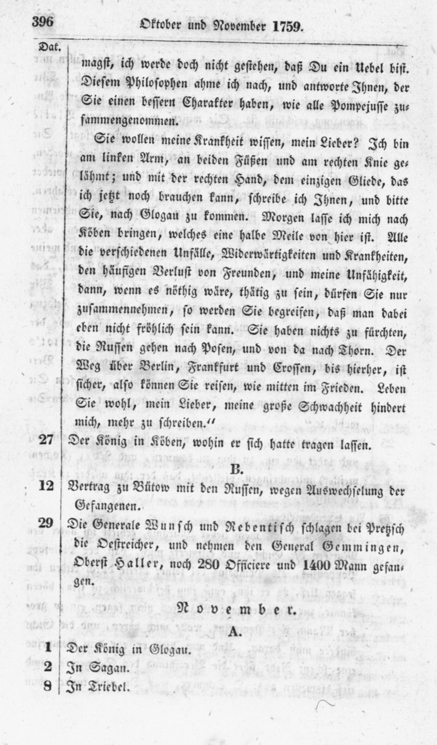 Sie wollen meine Krankheit wissen, mein Lieber? Ich bin am linken Arm, an beiden Füßen und am rechten Knie gelähmt; und mit der rechten Hand, dem einzigen Gliede, das ich jetzt noch brauchen kann, schreibe ich Ihnen, und bitte Sie, nach Glogau zu kommen. Morgen lasse ich mich nach Koben bringen, welches eine halbe Meile von hier ist. Alle die verschiedenen Unfälle, Widerwärtigkeiten und Krankheiten, den häufigen Verlust von Freunden, und meine Unfähigkeit, dann, wenn es nöthig wäre, thätig zu sein, dürfen Sie nur zusammennehmen, so werden Sie begreifen, daß man dabei eben nicht fröhlich sein kann. Sie haben nichts zu fürchten, die Russen gehen nach Posen, und von da nach Thorn. Der Weg über Berlin, Frankfurt und Crossen, bis hierher, ist sicher, also können Sie reisen, wie mitten im Frieden. Leben Sie wohl, mein Lieber, meine große Schwachheit hindert mich, mehr zu schreiben."