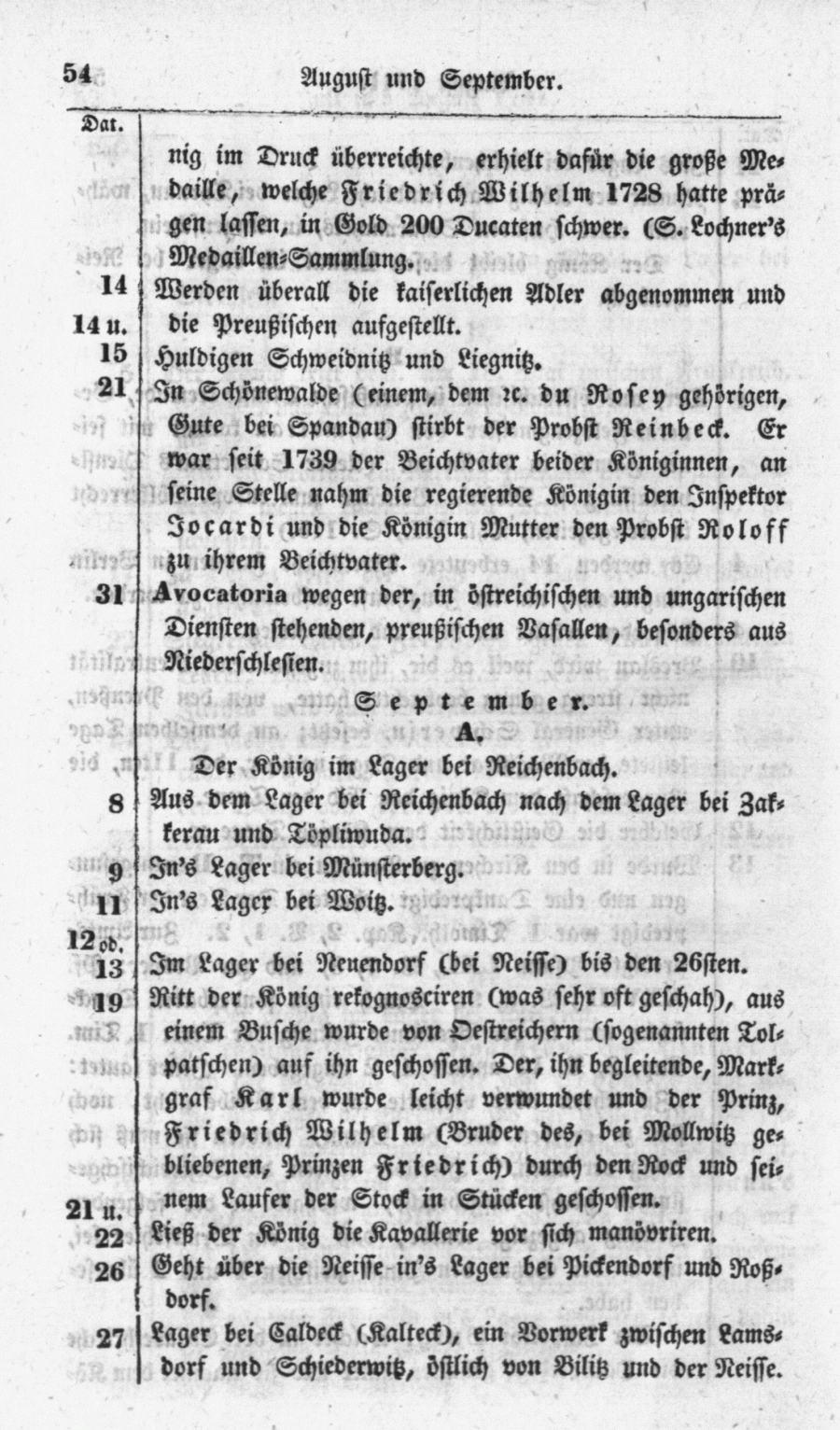 Ritt der König rekognosciren (was sehr oft geschah), aus einem Busche wurde von Östreichern (sogenannten Tolpatschen) auf ihn geschossen. Der, ihn begleitende, Markgraf Karl wurde leicht verwundet und der Prinz, Friedrich Wilhelm (Bruder des, bei Mollwitz gebliebenen, Prinzen Friedrich) durch den Rock und seinem Laufer der Stock in Stücken geschossen.