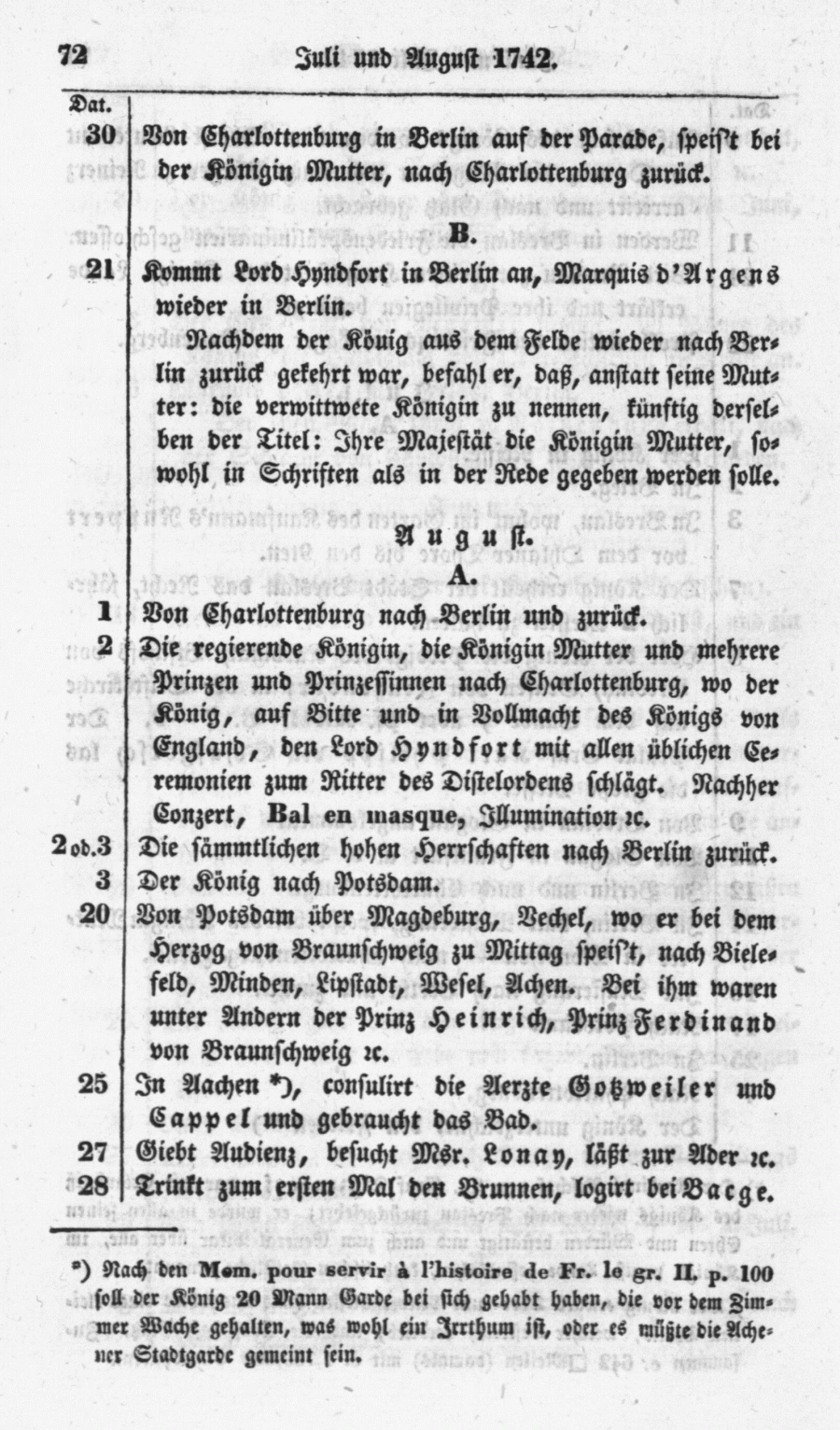 + Nach den Mem. pour servir à l'histoire Fr. le gr. II. p. 100 soll der König 20 Mann Garde bei sich gehabt haben, die vor dem Zimmer Wache gehalten, was wohl ein Irrthum ist, oder es müßte die Achener Stadtgarde gemeint sein.