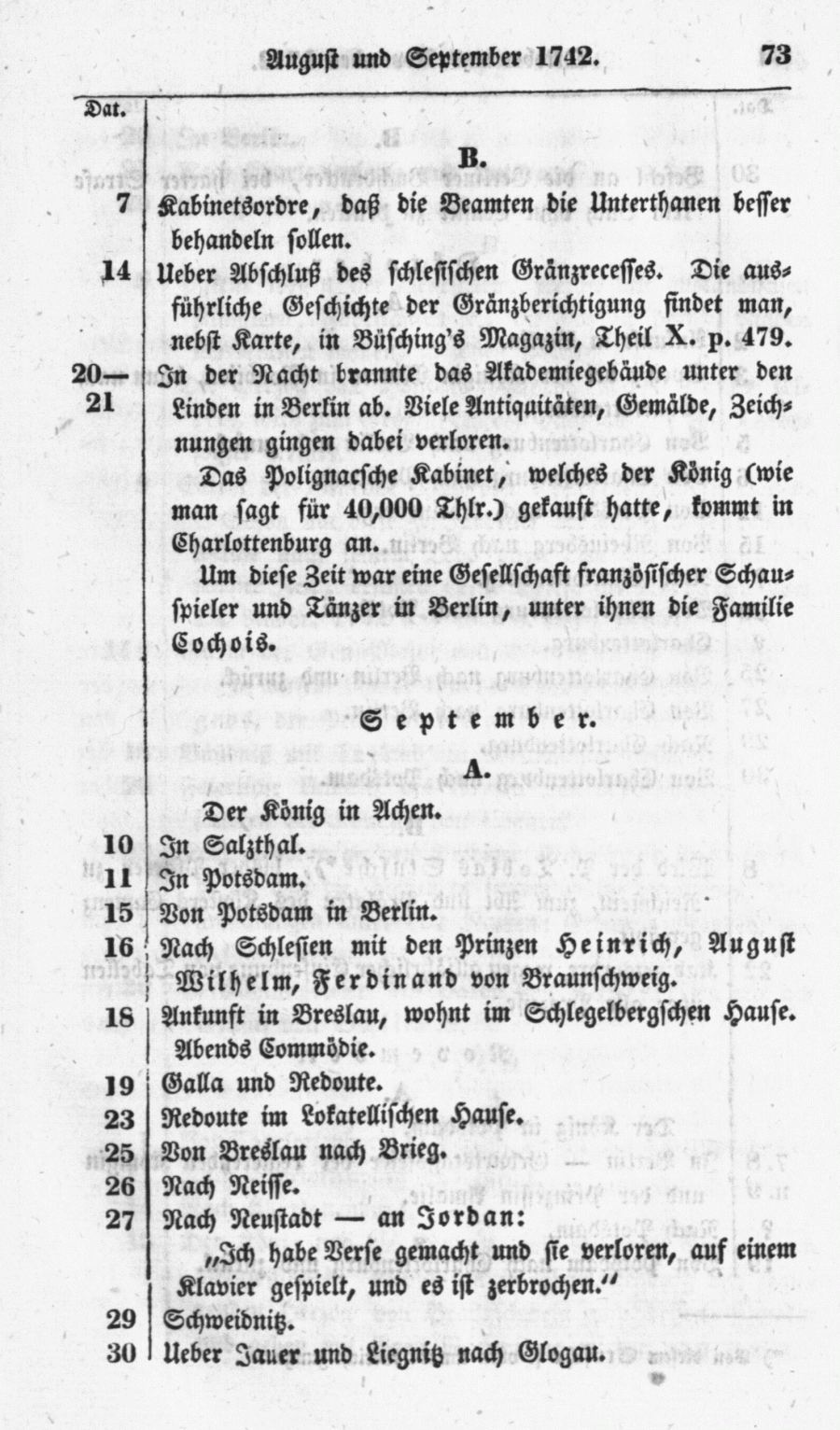In der Nacht brannte das Akademiegebäude unter den Linden in Berlin ab. Viele Antiquitäten, Gemälde, Zeichnungen gingen dabei verloren. Das Polignacsche Kabinet, welches der König (wie man sagt für 40,000 Thlr.) gekauft hatte, kommt in Charlottenburg an. Um diese Zeit war eine Gesellschaft französischer Schauspieler und Tänzer in Berlin, unter ihnen die Familie Cochois.