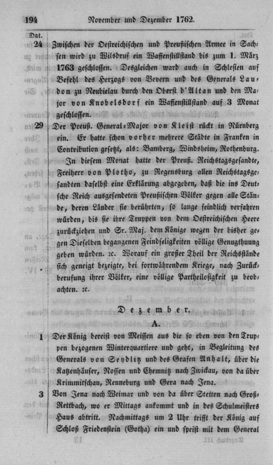 Zwischen der Oestreichischen und Preußischen Armee in Sachsen wird zu Wilsdruf ein Waffenstillstand bis zum 1. März 1763 geschlossen. Desgleichen ward auch in Schlesien ans Befehl des Herzogs von Bevern und des Generals Laudon zu Neubielau durch dm Oberst d'Altan und den Major von Knobelsdorf ein Waffenstillstand auf 3 Monat geschlossen.