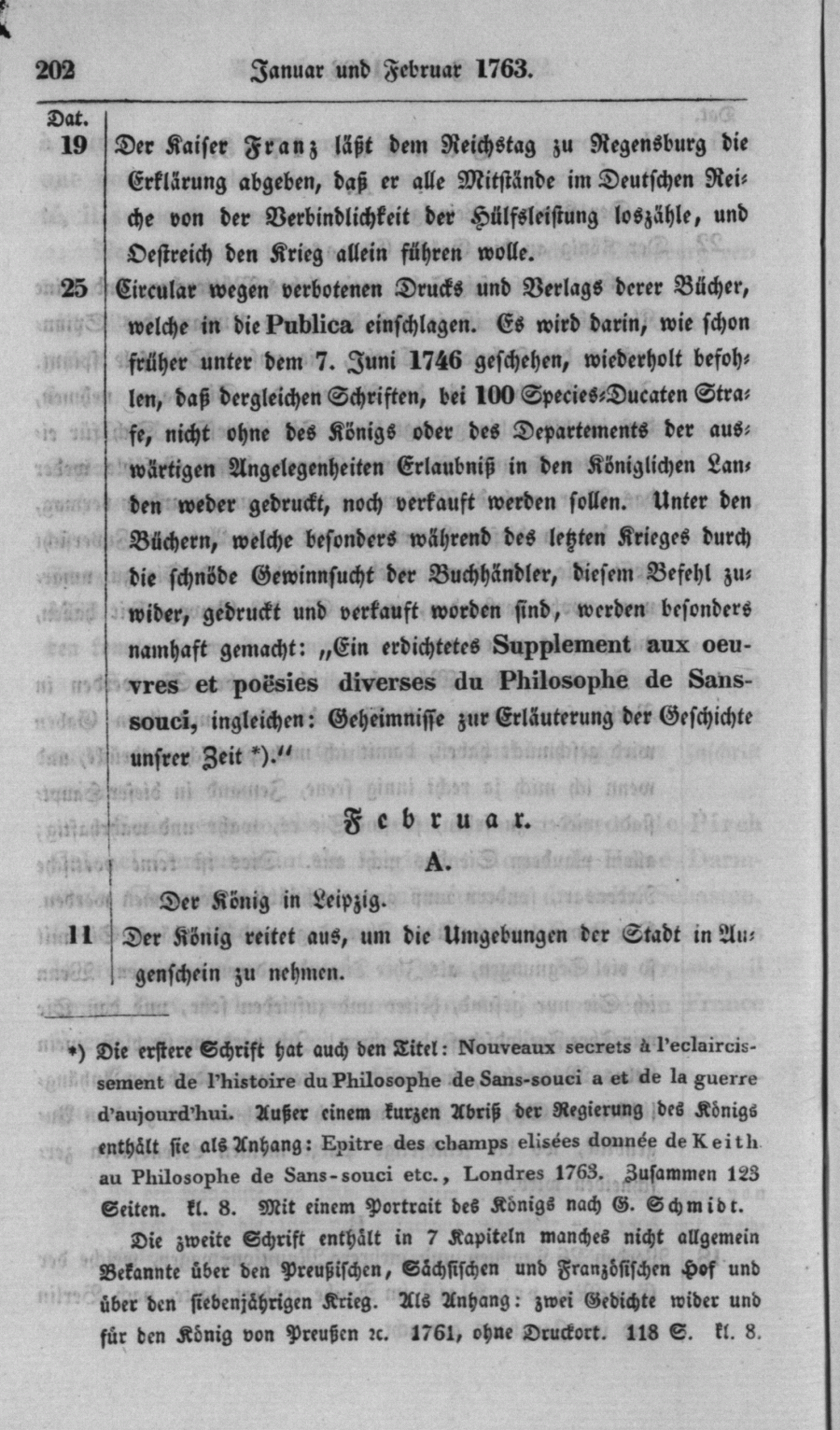 Circular wegen verbotenen Drucks und Verlags derer Bücher, welche in die Publica einschlagen. Es wird darin, wie schon früher unter dem 7. Juni 1746 geschehen, wiederholt befohlen, daß dergleichen Schriften, bei 100 Species-Ducaten Strafe, nicht ohne des Königs oder des Departements der auswärtigen Angelegenheiten Erlaubniß in den Königlichen Landen weder gedruckt, noch verkauft werden sollen. Unter den Büchern, welche besonders während des letzten Krieges durch die schnöde Gewinnsucht der Buchhändler, diesem Befehl zuwider, gedruckt und verkauft worden sind, werden besonders namhaft gemacht: "Ein erdichtetes Supplement aux oeuvres et poësies diverses du Philosophe de Sanssouci, ingleichen: Geheimnisse zur Erläuterung der Geschichte unsrer Zeit +."