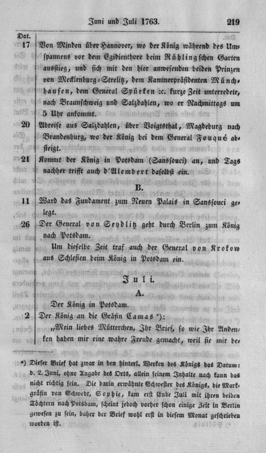 + Diesr Brief hat zwar in den hinterl. Werken des Königs das Datum : d. 2. Juni, ohne Angabe des Orts, allein seinem Inhalte nach kann das nicht richtig sein. Die darin erwähnte Schwester des Königs, die Markgräfin von Schwede, Sophie, kam erst Ende Juli mit ihren beiden Töchtern nach Potsdam, scheint jedoch vorher schon einige Zeit in Berlin gewesen zu sein, daher der Brief wohl erst in diesem Monat geschrieben worden ist.