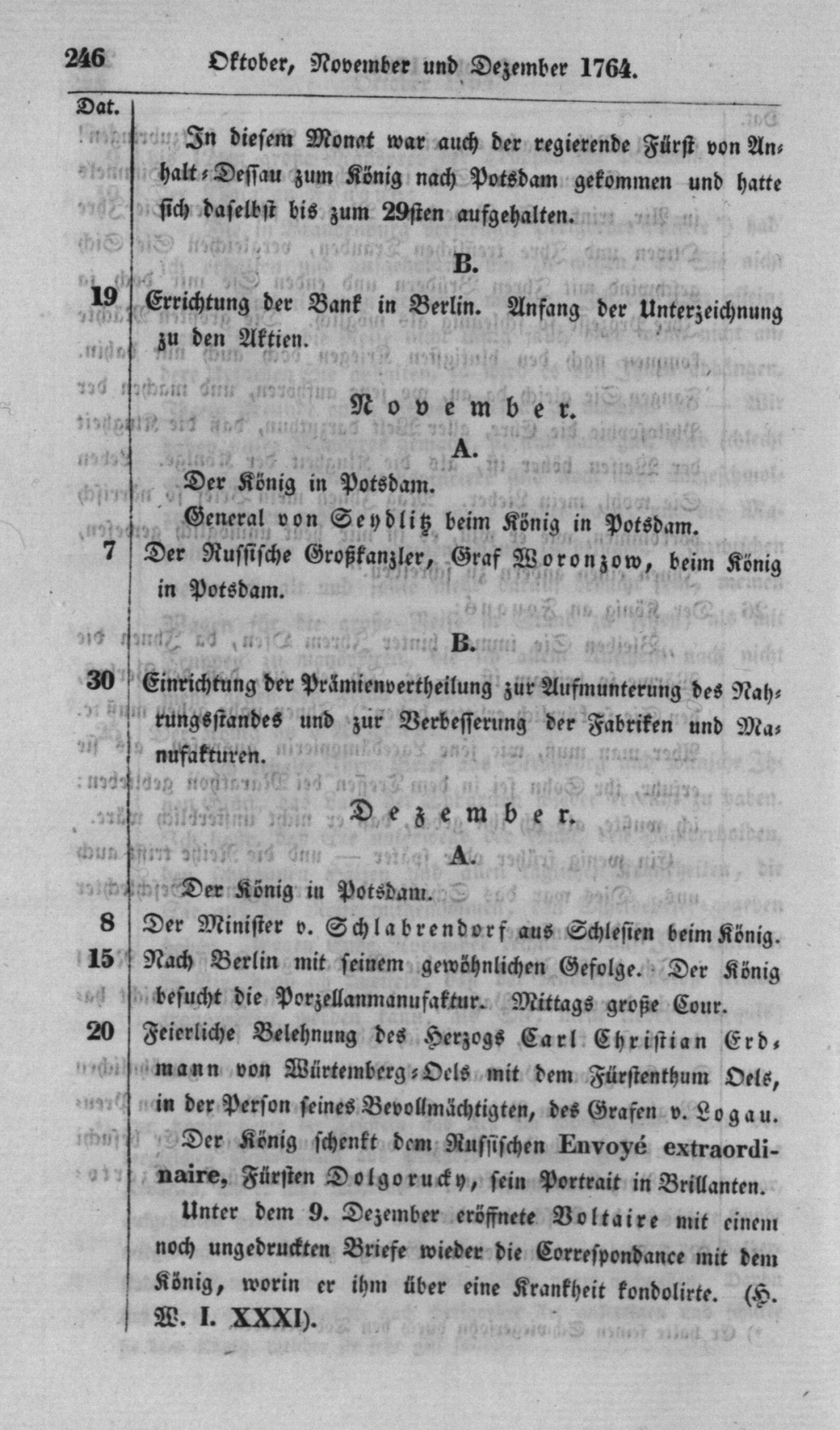 <246> In diesem Monat war auch der regierende Fürst von Anhalt-Dessau zum König nach Potsdam gekommen und hatte sich daselbst bis zum 23sten aufgehalten.