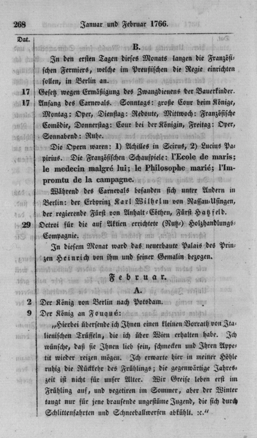 Anfang des Carnevals. Sonntags : große Cour beim Könige, Montag : Oper, Dienstag : Redoute, Mittwoch : Französische Comödie, Donnerstag : Cour bei der Königin, Freitag : Oper, Sonnabend : Ruhe.