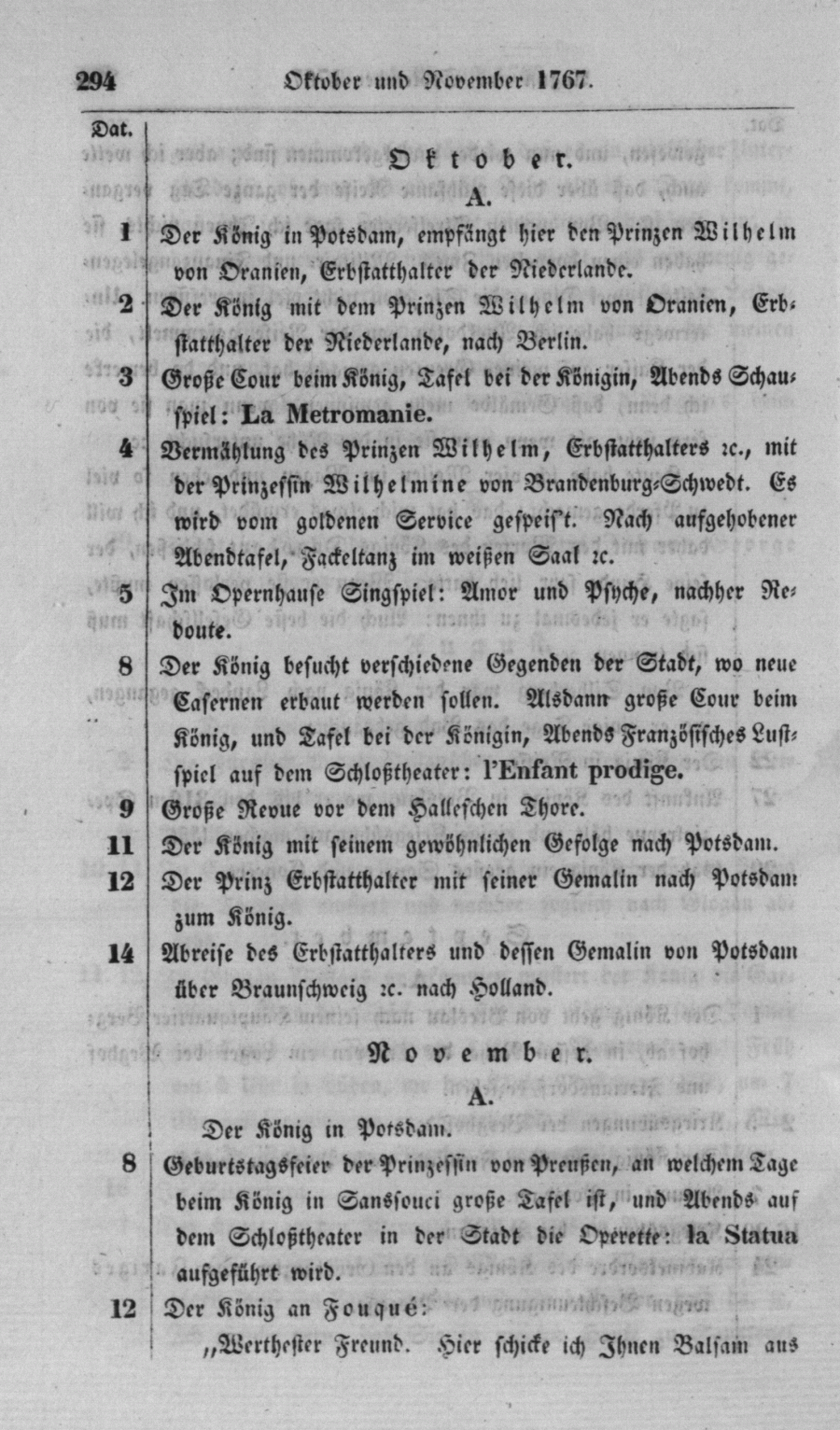 Der König besucht verschiedene Gegenden der Stabt, wo neue Casernen erbaut werden sollen. Alsdann große Cour beim König, und Tafel bei der Königin, Abends Französisches Lustspiel auf dem Schloßtheater : l'Enfant prodige.