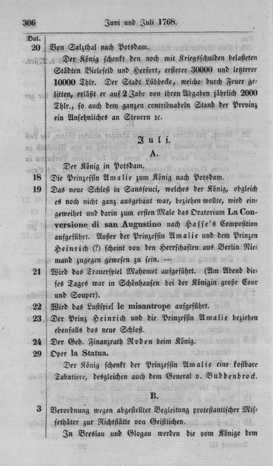 Von Salzthal nach Potsdam. Der König schenkt den noch mit Kriegsschulden belasteten Städten Bielefeld und Herfort, ersterer 30000 und letzterer 10000 Thlr. Der Stadt Lübbecke, welche durch Feuer gelitten, erläßt er auf 2 Jahr von ihren Abgaben jährlich 2000 Thlr., so auch dem ganzen contribuabeln Stand der Provinz ein Ansehnliches an Steuern etc.