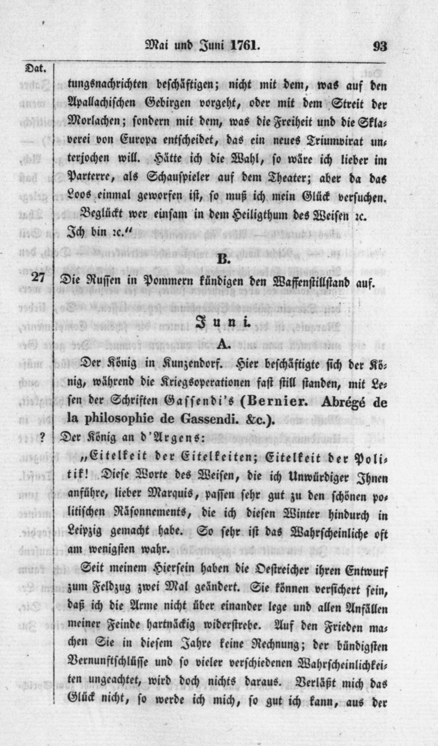 "Eitelkeit der Eitelkeiten; Eitelkeit der Politik! Diese Worte des Weisen, die ich Unwürdiger Ihnen anführe, lieber Marquis, passen sehr gut zu den schönen politischen Räsonnements, die ich diesen Winter hindurch in Leipzig gemacht habe. So sehr ist das Wahrscheinliche oft am wenigsten wahr.