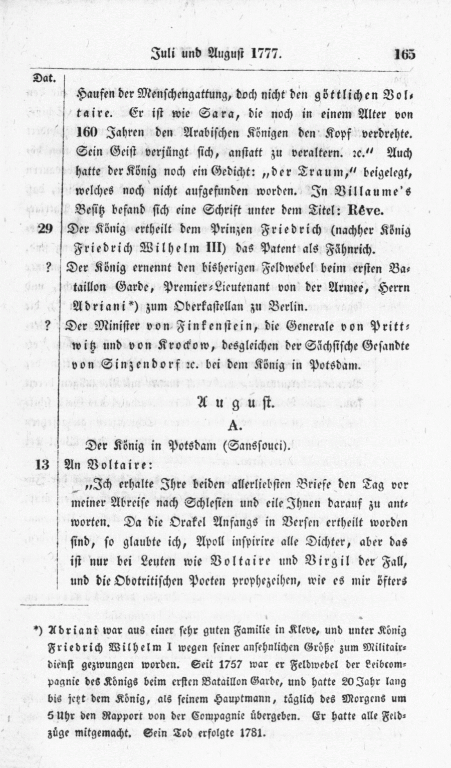 + Adriani war aus einer sehr guten Familie in Kleve, und unter König Friedrich Wilhelm I wegen seiner ansehnlichen Größe zum Militärdienst gezwungen worden. Seit 1757 war er Feldwebel der Leibcompagnie des Königs beim ersten Bataillon Garde, und hatte 20 Jahr lang bis jetzt dem König, als seinem Hauptmann, täglich des Morgens um 5 Uhr den Rapport von der Compagnie übergeben. Er hatte alle Feldzüge mitgemacht. Sein Tod erfolgte 1781.