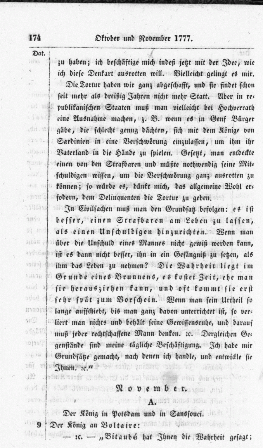 <174> zu haben; ich beschäftige mich indeß jetzt mit der Idee, wie ich diese Denkart ausrotten will. Vielleicht gelingt es mir. Die Tortur haben wir ganz abgeschafft, und sie findet schon seit mehr als dreißig Jahren nicht mehr Statt. Aber in republikanischen Staaten muß man vielleicht bei Hochverrat!) eine Ausnahme machen, z. B. wenn es in Genf Bürger gäbe, die schlecht genug dächten, sich mit dem Könige von Sardinien in eine Verschwörung einzulassen, um ihm ihr Vaterland in die Hände zu spielen. Gesetzt, man entdeckte einen von den Strafbaren und müßte nothwendig seine Mitschuldigen wissen, um die Verschwörung ganz ausrotten zu können; so würde es, dünkt mich, das allgemeine Wohl erfodern, dem Delinquenten die Tortur zu geben.