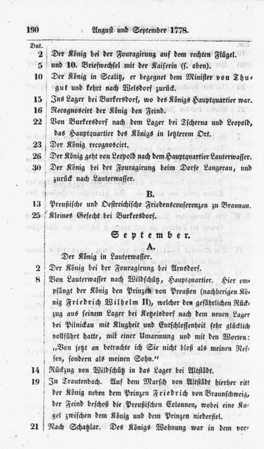 Von Lauterwasser nach Wildschütz, Hauptquartier. Hier empfängt der König den Prinzek von Preußen (nachherigen König Friedrich Wilhelm II), welcher den gefährlichen Rückzug aus seinem Lager bei Ketzelsdorf nach dem neuen Lager bei Pilnickau mit Klugheit und Entschlossenheit sehr glücklich vollführt hatte, mit einer Umarmung und mit den Worten : "Von jetzt an betrachte ich Sie nicht bloß als meinen Neffen, sondern als meinen Sohn."