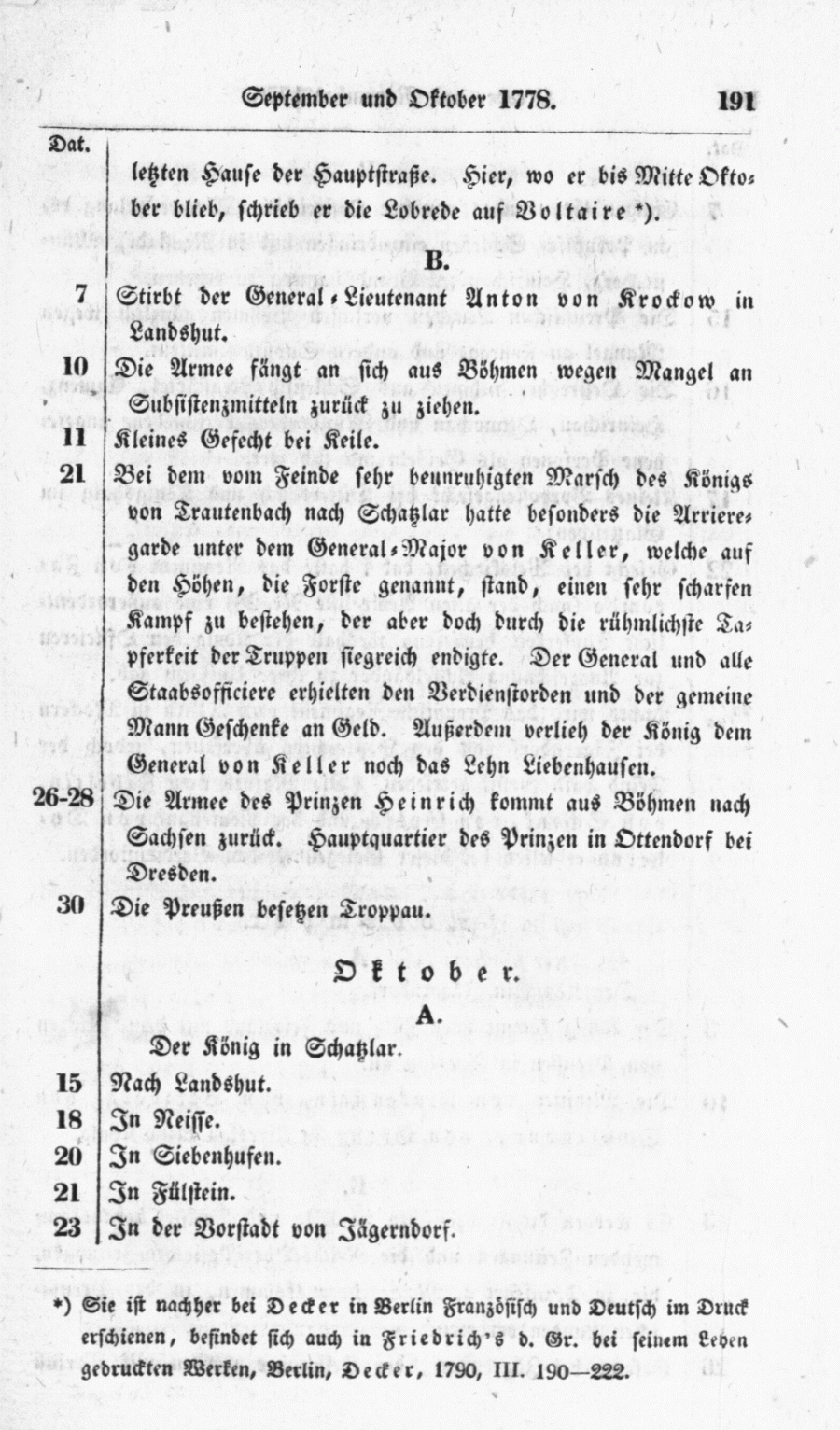 + Sie ist nachher bei Decker in Berlin Französisch und Deutsch im Druck erschienen, befindet sich auch in Friedrich's d. Gr. bei seinem Leben gedruckten Werken, Berlin, Decker, 1790, III. 190-222.