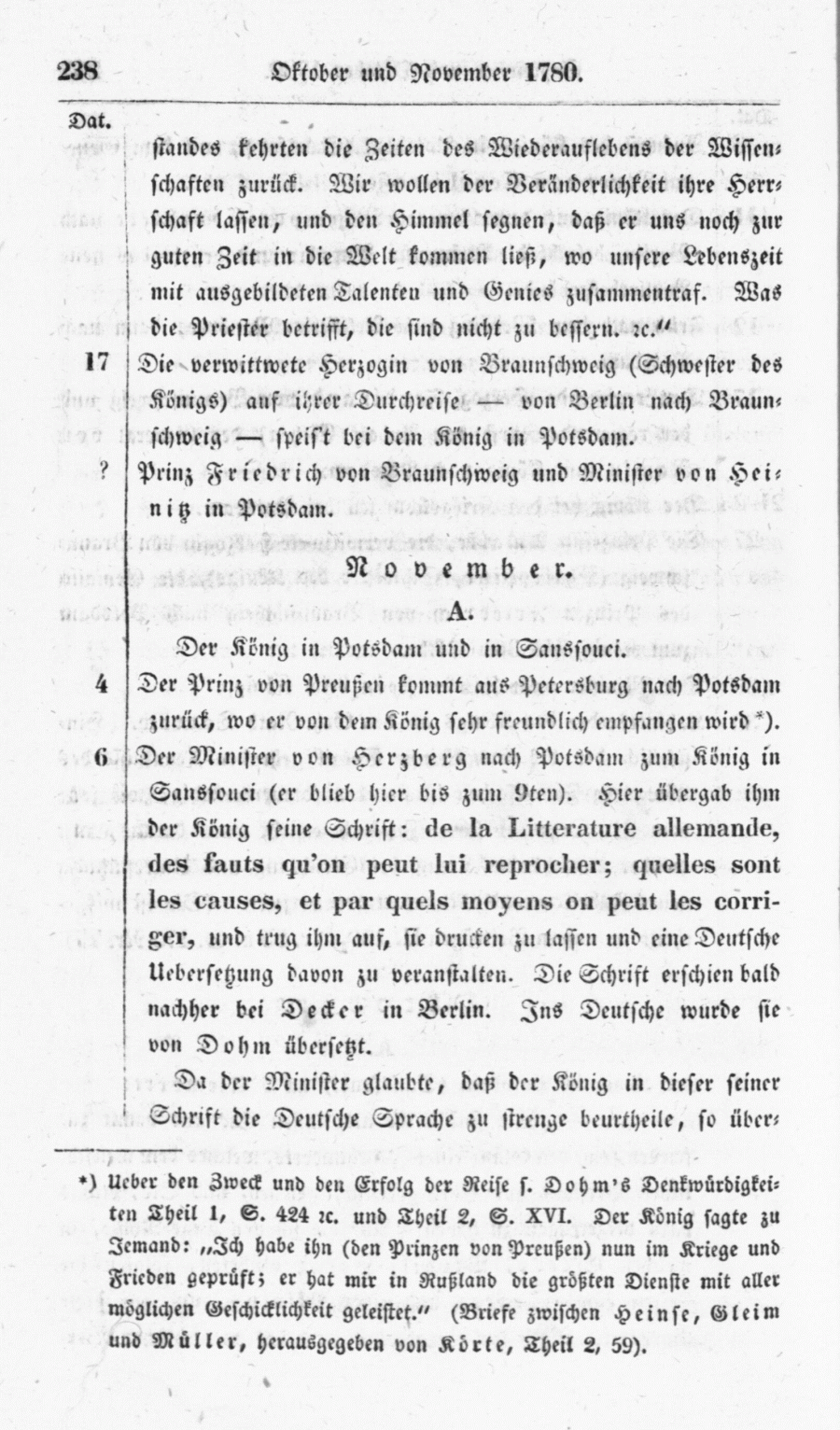 Der Prinz von Preußen kommt aus Petersburg nach Potsdam zurück, wo er von dem König sehr freundlich empfangen wird +. Der Minister von Herzberg nach Potsdam zum König in Sanssouci (er blieb hier bis zum 9ten). Hier übergab ihm der König seine Schrift : de la Litterature allemande, des fauts qu'on peut lui reprocher; quelles sont les causes, et par quels moyens on peut les corriger, und trug ihm auf, sie drucken zu lassen und eine Deutsche Uebersetzung davon zu veranstalten. Die Schrift erschien bald nachher bei Decker in Berlin. Ins Deutsche wurde sie von Dohm übersetzt.
