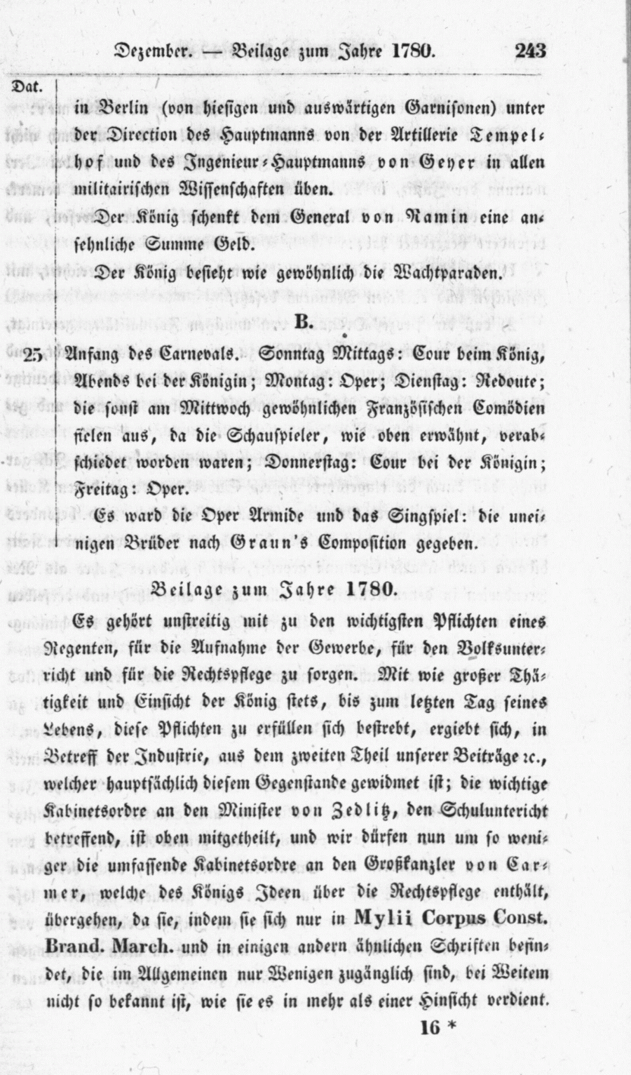 Es gehört unstreitig mit zu den wichtigsten Pflichten eines Regenten, für die Aufnahme der Gewerbe, für den Volksunterricht und für die Rechtspflege zu sorgen. Mit wie großer Thätigkeit und Einsicht der König stets, bis zum letzten Tag seines Lebens, diese Pflichten zu erfüllen sich bestrebt, ergiebt sich, in Betreff der Industrie, aus dem zweiten Theil unserer Beiträge etc., welcher hauptsächlich diesem Gegenstände gewidmet ist; die wichtige Kabinetsordre an den Minister von Zedlitz, den Schuluntericht betreffend, ist oben mitgetheilt, und wir dürfen nun um so weniger die umfassende Kabinetsordre an den Großkanzler von Carmer, welche des Königs Ideen über die Rechtspflege enthält, übergehen, da sie, indem sie sich nur in Mylii Corpus Const. Brand. March. und in einigen andern ähnlichen Schriften befindet, die im Allgemeinen nur Wenigen zugänglich sind, bei Weitem nicht so bekannt ist, wie sie es in mehr als einer Hinsicht verdient.