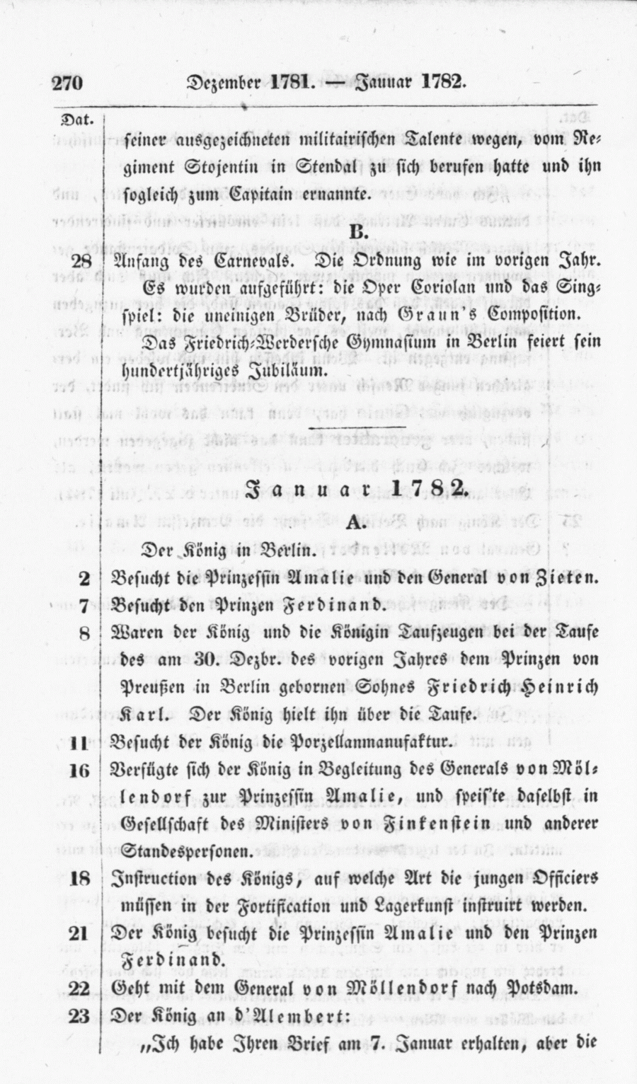Verfügte sich der König in Begleitung des Generals von Mollendorf zur Prinzessin Amalie, und speiste daselbst in Gesellschaft des Ministers von Finken stein und anderer Standespersonen.
