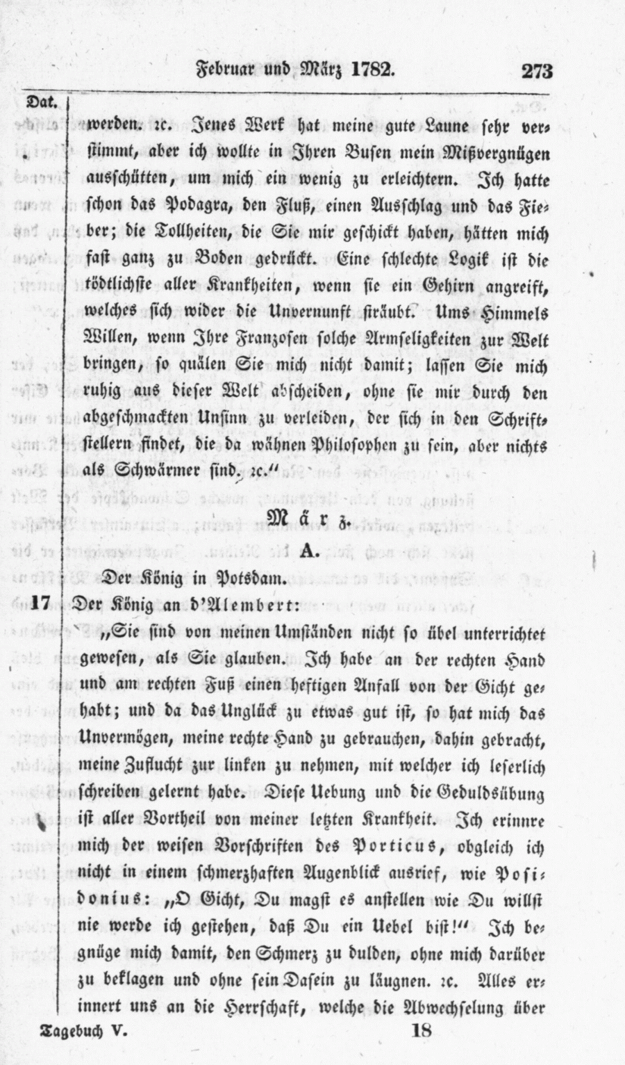 Der König an d'Alembert: "Sie sind von meinen Umständen nicht so übel unterrichtet gewesen, als Sie glauben. Ich habe an der rechten Hand und am rechten Fuß einen heftigen Anfall von der Gicht gehabt; und da das Unglück zu etwas gut ist, so hat mich das Unvermögen, meine rechte Hand zu gebrauchen, dahin gebracht, meine Zuflucht zur linken zu nehmen, mit welcher ich leserlich schreiben gelernt habe. Diese Uebung und die Geduldsübung ist aller Vortheil von meiner letzten Krankheit. Ich erinnre mich der weisen Vorschriften des Porticus, obgleich ich nicht in einem schmerzhaften Augenblick ausrief, wie Posidonius: "O Gicht, Du magst es anstellen wie Du willst nie werde ich gestehen, daß Du ein Uebel bist!" Ich begnüge mich damit, den Schmerz zu dulden, ohne mich darüber zu beklagen und ohne sein Dasein zu läugnen. etc. Alles erinnert uns an die Herrschaft, welche die Abwechselung über"