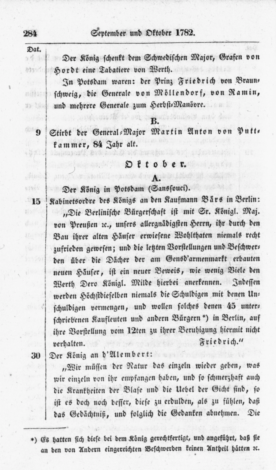 Kabinetsordre des Königs an den Kaufmann Bärs in Berlin: "Die Berlinische Bürgerschaft ist mit Sr. Konigl. Maj. von Preußen etc., unsers allergnädigsten Herrn, ihr durch den Bau ihrer alten Häuser erwiesene Wohlthaten niemals recht zufrieden gewesen; und die letzten Vorstellungen und Beschwerden über die Dächer der am Gensd'armenmarkt erbauten neuen Häuser, ist ein neuer Beweis, wie wenig Viele den Werth Dero Königl. Milde hierbei anerkennen. Indessen werden Hochstdieselben niemals die Schuldigen mit denen Unschuldigen vermengen, und wollen solches denen 45 unterschriebenen Kaufleuten und andern Bürgern + in Berlin, auf ihre Vorstellung vom 12ten zu ihrer Beruhigung hiermit nicht verhalten. Friedrich."