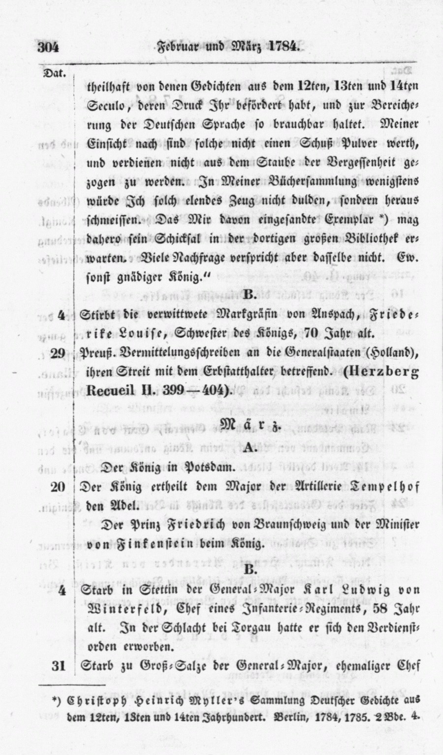 "<304>theilhaft von denen Gedichten aus dem 12ten, 13ten und 14ten Seculo, deren Druck Ihr befördert habt, und zur Bereicherung der Deutschen Sprache so brauchbar haltet. Meiner Einsicht nach sind solche nicht einen Schuß Pulver werth, und verdienen nicht aus dem Staube der Vergessenheit gezogen zu werden. In Meiner Büchersammlung wenigstens würde Ich solch elendes Zeug nicht dulden, sondern heraus schmeissen. Das Mir davon eingesandte Exemplar + mag dahero sein Schicksal in der dortigen großen Bibliothek erwarten. Viele Nachfrage verspricht aber dasselbe nicht. Ew. sonst gnädiger König."