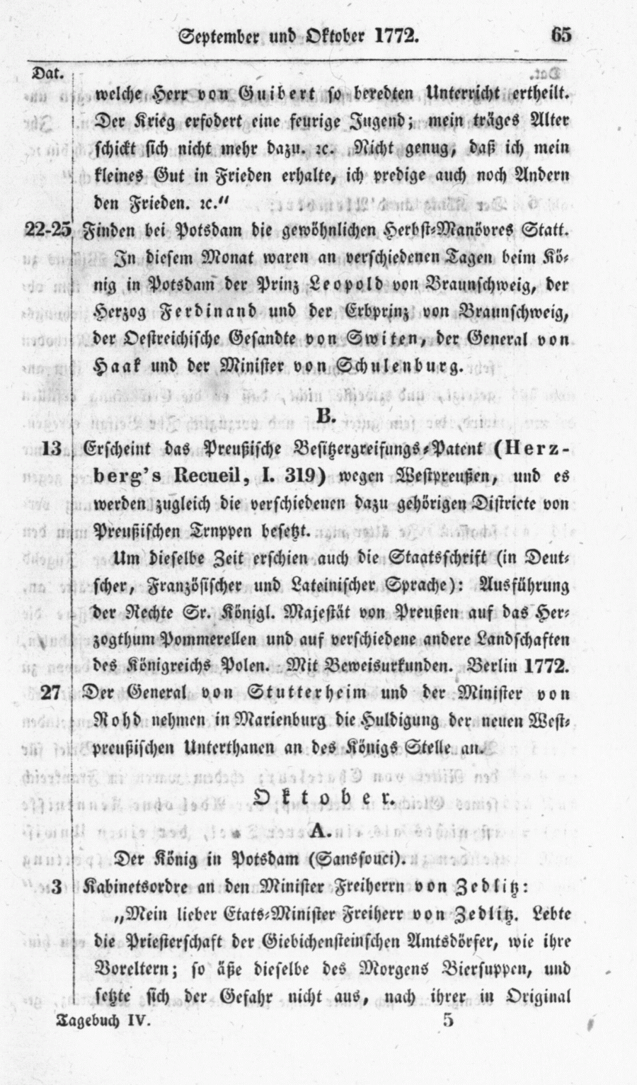 Um dieselbe Zeit erschien auch die Staatsschrift (in Deutscher, Französischer und Lateinischer Sprache): Ausführung der Rechte Sr. Königl. Majestät von Preußen auf das Herzogthum Pommerellen und auf verschiedene andere Landschaften des Königreichs Polen. Mit Beweisurkunden. Berlin 1772. Der General von Stutterheim und der Minister von Rohd nehmen in Marienburg die Huldigung der neuen Westpreußischen Unterthanen an des Königs Stelle an.