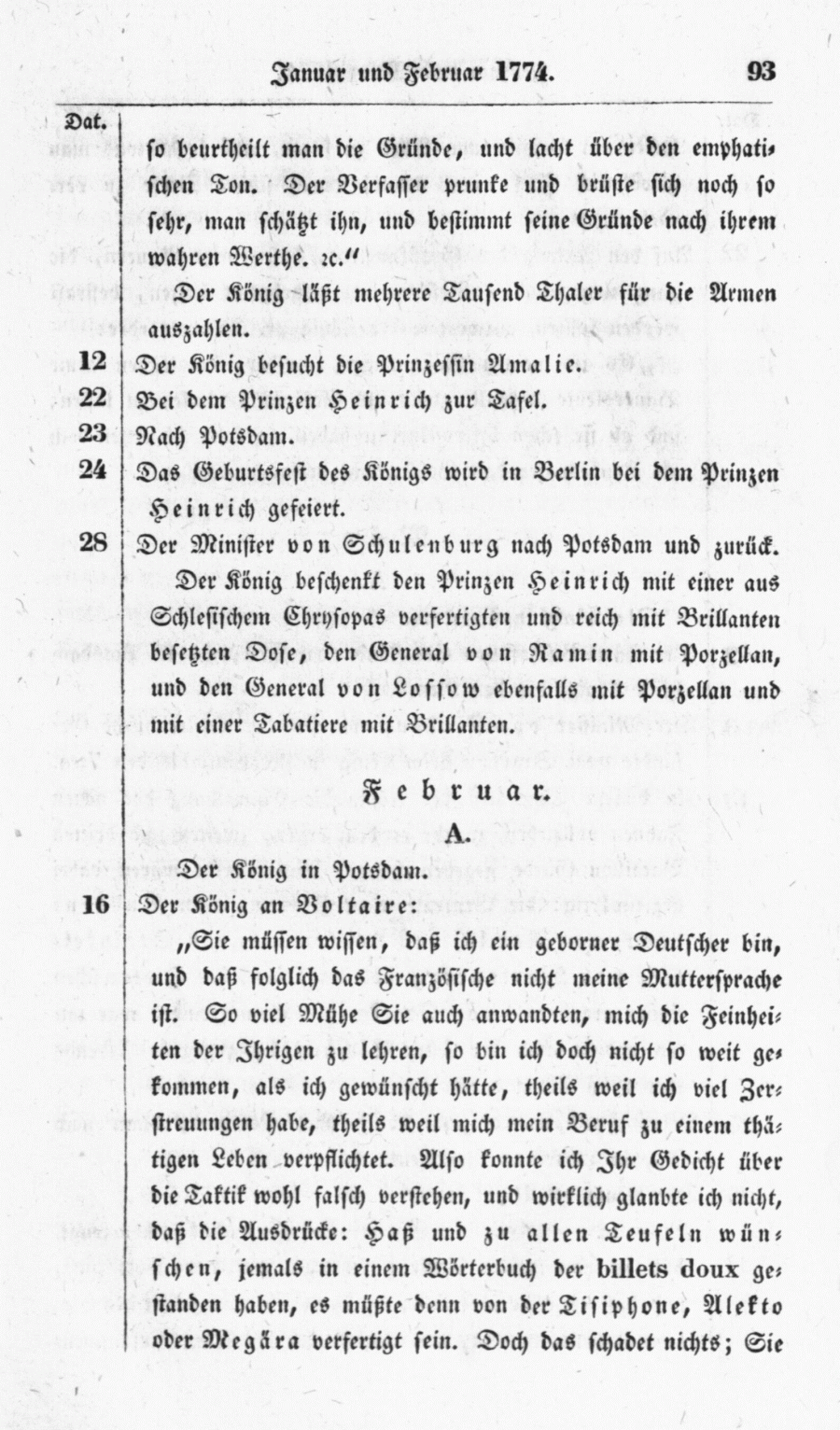 "Sie müssen wissen, daß ich ein geborner Deutscher bin, und daß folglich das Französische nicht meine Muttersprache ist. So viel Mühe Sie auch anwandten, mich die Feinheiten der Ihrigen zu lehren, so bin ich doch nicht so weit gekommen, als ich gewünscht hätte, theils weil ich viel Zerstreuungen habe, theils weil mich mein Beruf zu einem thätigen Leben verpflichtet. Also konnte ich Ihr Gedicht über die Taktik wohl falsch verstehen, und wirklich glaubte ich nicht, daß die Ausdrücke: Haß und zu allen Teufeln wünschen, jemals in einem Wörterbuch der billets doux gestanden haben, es müßte denn von der Tisiphone, Alekto oder Megära verfertigt sein. Doch das schadet nichts; Sie"