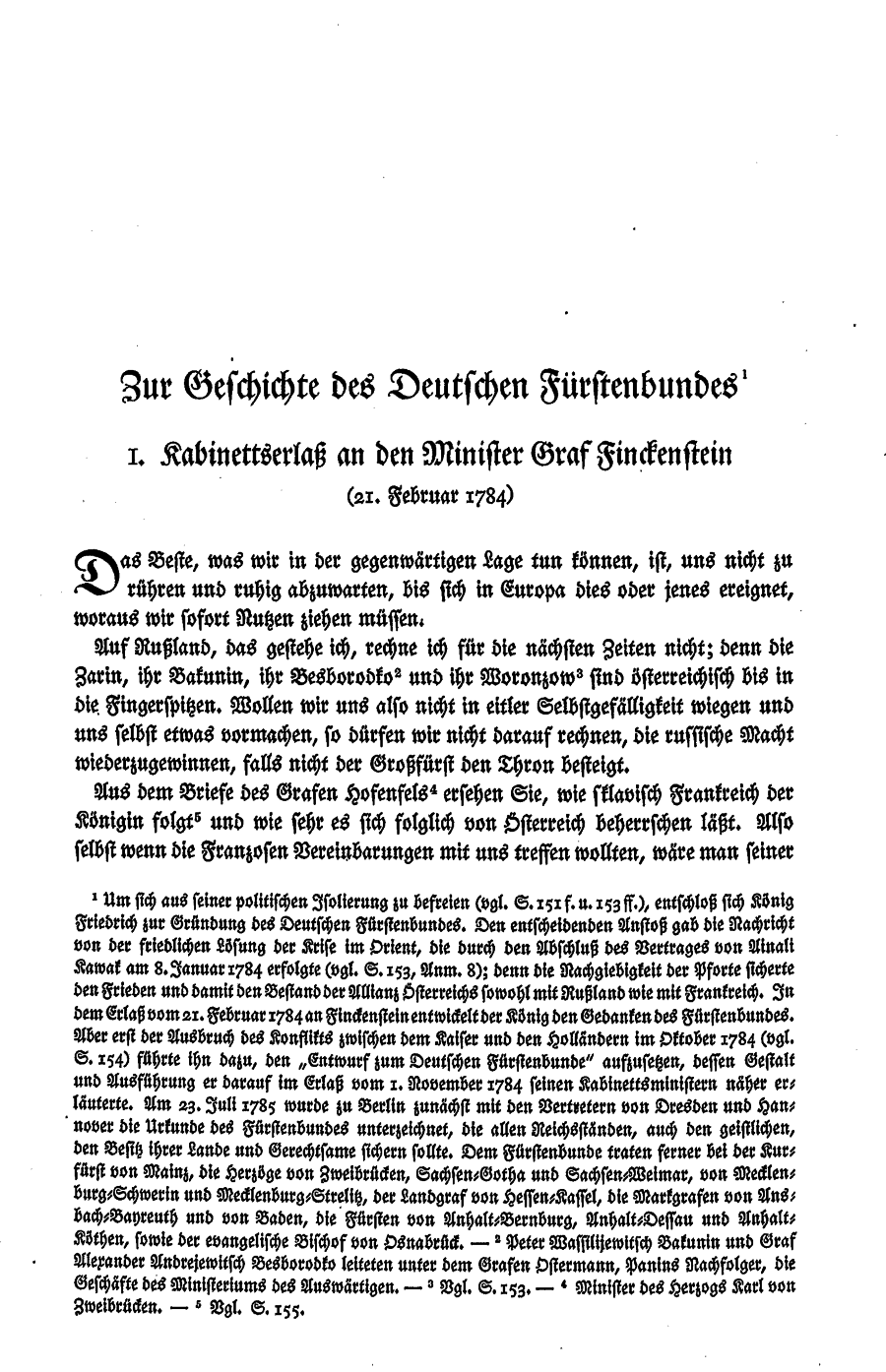 1 Um sich aus seiner politischen Isolierung zu befreien (vgl. S. 151 f. u. 153 ff.), entschloß sich König Friedrich zur Gründung des Deutschen Fürstenbundes. Den entscheidenden Anstoß gab die Nachricht von der friedlichen Lösung der Krise im Orient, bie durch den Abschluß des Vertrages von Ainali Kawak am 8. Januar 1784 erfolgte (vgl. S. 153, Anm. 8); denn die Nachgiebigkeit der Pforte sicherte den Frieden und damit den Bestand der Allianz Österreichs sowohl mit Rußland wie mit Frankreich. In dem Erlaß vom 21. Februar 1784 an Finckenstein entwickelt der König den Gedanken des Fürstenbundes.