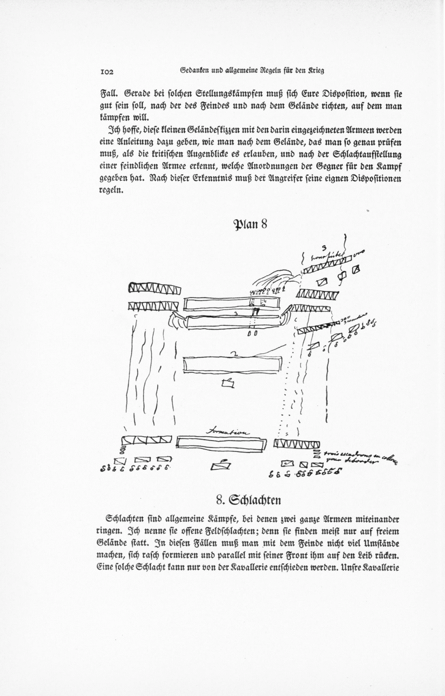 <102> Fall. Gerade bei solchen Stellungskämpfen muß sich Eure Disposition, wenn sie gut sein soll, nach der des Feindes und nach dem Gelände richten, auf dem man kämpfen will.