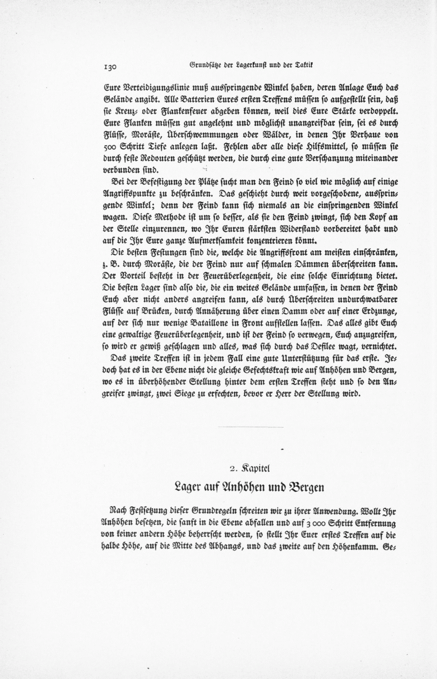 Die besten Festungen sind die, welche die Angriffsfront am meisten einschränken, z. B. durch Moräste, die der Feind nur auf schmalen Dämmen überschreiten kann. Der Vorteil besieht in der Feuerüberlegenheit, die eine solche Einrichtung bittet. Die besten Lager sind also die, die ein weites Gelände umfassen, in denen der Feind Euch aber nicht anders angreifen kann, als durch Überschreiten undurchwatbarer Flüsse auf Brücken, durch Annäherung über einen Damm oder auf einer Erdzunge, auf der sich nur wenige Bataillone in Front aufstellen lassen. Das alles gibt Euch eine gewaltige Feuerüberlegenheit, und ist der Feind so verwegen, Euch anzugreifen, so wird er gewiß geschlagen und alles, was sich durch das Defilee wagt, vernichtet.