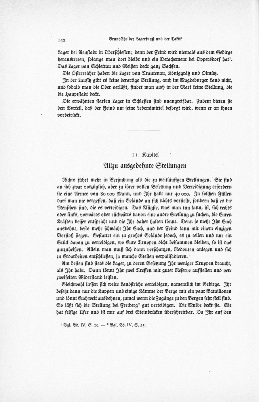 Nichts fühlt mehr in Versuchung als die zu weitläufigen Stellungen. Sie sind an sich zwar vorzüglich, aber zu ihrer vollen Besetzung und Verteidigung erfordern sie eine Armee von 80 000 Mann, und Ihr habt nur 40 000. In solchen Fällen darf man nie vergessen, daß ein Gelände an sich nichts vorstellt, sondern daß es die Menschen sind, die es verteidigen. Das Klügste, was man tun kann, ist, sich rechts oder links, vorwärts oder rückwärts davon eine andre Stellung zu suchen, die Euren Kräften besser entspricht und die Ihr daher halten könnt. Denn je mehr Ihr Euch ausdehnt, desto mehr schwächt Ihr Euch, und der Feind kann mit einem einzigen Vorstoß siegen. Gestattet ein zu großes Gelände jedoch, es zu teilen und nur ein Stück davon zu verteidigen, wo Eure Truppen dicht beisammen bleiben, so ist das gutzuheißen. Allein man muß sich dann verschanzen, Redouten anlegen und sich zu Erdarbeiten entschließen, ja manche Stellen verpalisadieren.