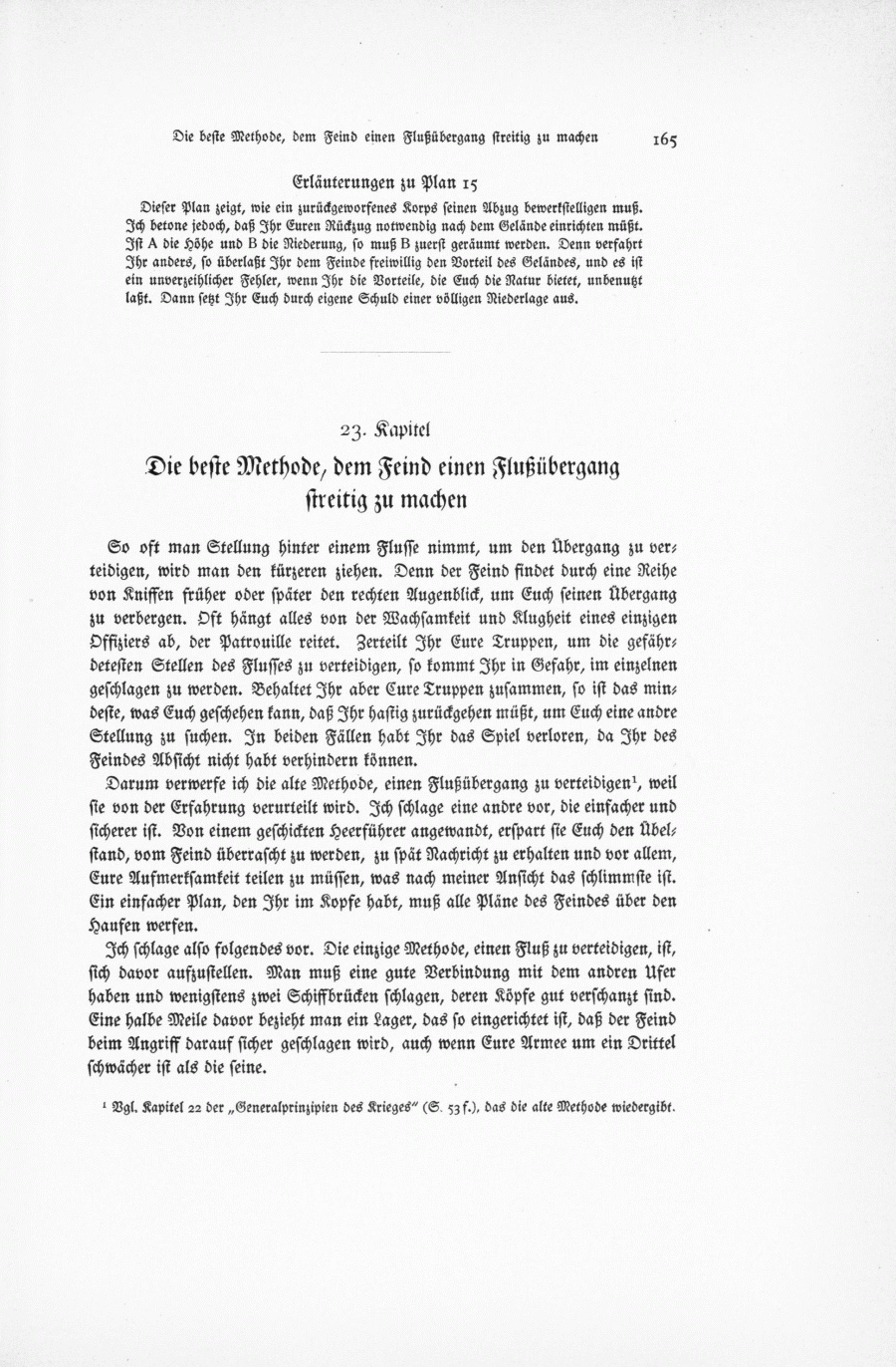 Darum verwerfe ich die alte Methode, einen Flußübergang zu verteidigen1, weil sie von der Erfahrung verurteilt wird. Ich schlage eine andre vor, die einfacher und sicherer ist. Von einem geschickten Heerführer angewandt, erspart sie Euch den Übelstand, vom Feind überrascht zu werden, zu spät Nachricht zu erhalten und vor allem, Eure Aufmerksamkeit teilen zu müssen, was nach meiner Ansicht das schlimmste ist. Ein einfacher Plan, den Ihr im Kopfe habt, muß alle Pläne des Feindes über den Haufen werfen.